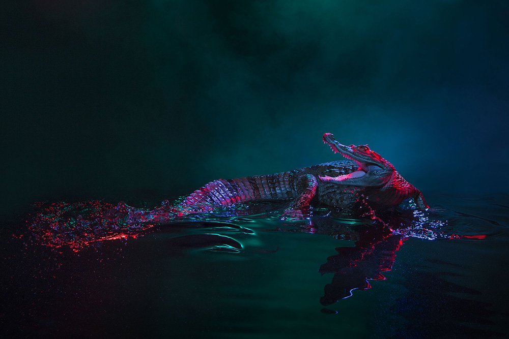 The curtain lifts on an ancient beast. In water, on land he dwells. There is but silence, all is still, no rousing of the ancient. But pause a while and watch, my friend, for from the darkest depths he stirs. If you are patient. If you watch. Slowly, carrying history's weight, the heaviness of time, he rises, and takes centre stage - he is prehistoric, trapped in time, unbound by time, a ruler, a victim, wandering, lumbering through vast centuries. The ancient bids you welcome, friend. Come one, come all, humans, species, come spirits, too! Feast your eyes on infinity's great actor. Here's our star - don't stand too close; the crocodile lives! The house lights dip, the scene is set. Two eyes, fierce teeth, a gnarled facade - the ancient claims his place. Enter his habitat. Survey his tracks. Assess for danger, assess the land. From him, we hear no weeping, in spite of what humans do. We cry crocodile tears while hunting hides for handbags, adorning ourselves with his skin - we are nature's terror, his eternal fear. The ancient knows his place. Step beyond the stage and into the world of Caiman crocodilus. Trace his blood- line back through eons, to earlier times, prehistoric ages - he is magnificent, a glorious performer in nature's great play. Caiman crocodilus, is explored and celebrated. Step out of time, trace a path back to what was once there, before humanity was even a dream, and what still is – welcome, friend, and meet the ancient. Created in front of a live audience, this body of work mixes still images with live demonstration, education and performance art, all unraveling the crocodile's great mysteries.