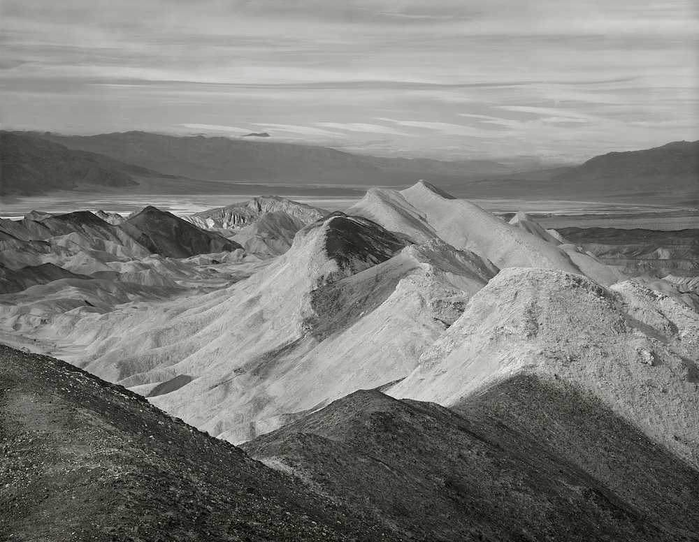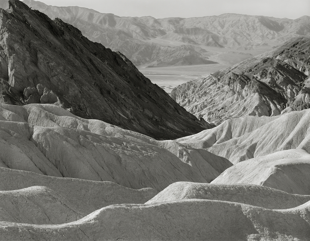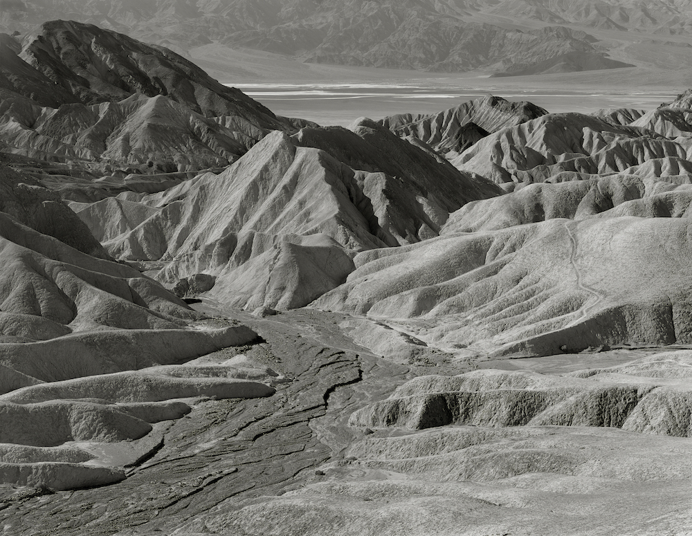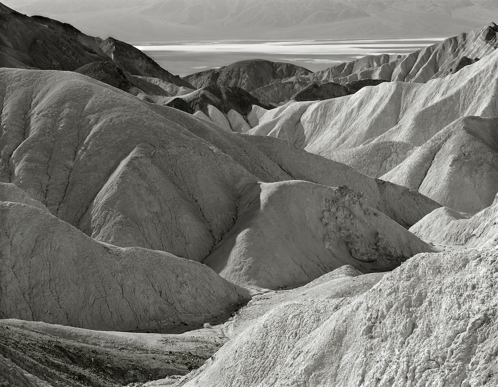These images were first realized on the ground glass of an 8X10 large format camera. After I composed, focused, and metered the images, I inserted the film holder and selected the f-stop. With the shutter set and cocked, and the dark slide removed, I released the shutter and held my breath–as if not breathing would prevent failure of the image. Racing against time and the possibility of nature encroaching with a hearty gust of wind, the shutter whirred for a second or two before it stopped again. I released my breath. The result is moments in time burned and recorded in silver on single sheets of 8×10 film. I am drawn to the barren riches that the desert offers with its wilderness of sharp patterns, mottled hues and sun-bleached rock formations. It is a harshly illuminated landscape that can overpower and bewilder the eye. In this desert environment–where it is easy to wonder if nature has in fact died–there is an essential character that reveals itself through careful observation. I place my camera before a landscape subject and take in every detail. I am interested in conveying the subtle essence of a subject through its natural form with a sharply focused but gentle intensity. A different world begins when these natural formations are distilled, revealing themselves to me in this moment of motionlessness. There is only one negative and thus but one chance to produce the image. Within moments the evanescent beauty of the desert–lovely and strange and frequently subtle–shifts again under the piercing rays of the sun. Image Titles: 1. Twenty Mule Team Canyon, Death Valley, California 2. Badlands, Death Valley, California 3. Zabriskie Point, Death Valley, California 4. Golden Canyon, Death Valley, California