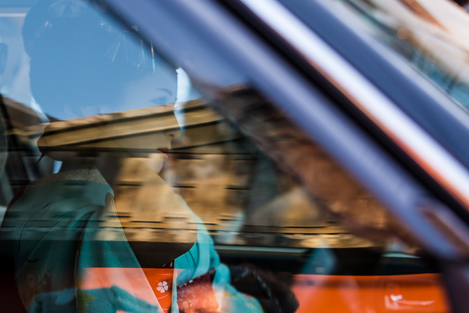 Geisha hiding from tourists behind a car's glass, Gion, Kyoto, Japan