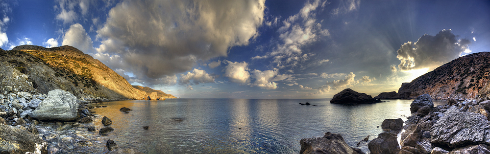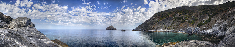 If, to quote from Joachim Ritter (To topio, Athens 2004: Potamos, p.59), landscapes «become landscapes only when man turns towards them without any practical purpose, in the sense of experiencing a ‘free’ enjoyable vision, as if he were in nature himself», then the question that Yorgos Nounesis’s photographs raise does not concern solely and exclusively their technical particularities, nor the landscapes themselves as images of nature which bear the trace of civilization. This photography series, invites the spectator to turn towards the ‘free’ enjoyable vision’ which they portray. Nevertheless, the carefully selected shot angles and the repeated temporal moments which coexist inside the same photograph -Yorgos Nounesis uses the modern technique of HDRI- operate in a way which make the photographical landscapes lose their anchoring to their geographical reality. At that exact point, however, one comes into touch with this “defamilarizing†experience which in fact creates these panoramic photos: the imprinting of this loss has been transformed into a positive aesthetic viewing experience. Afroditi Nikolaidou, Doctor in Visual Communication, Department of Communication, Media and Culture, Panteion University Amorgos in a year. The landscapes that I photograph, both under and above the water, are not trying to be just documents of the view or just beautiful compositions. The idea of proximity or non-proximity -often only addressed to the local inhabitants but maybe that is also another point of my work, that of locality in terms of small groups losing their identity and often the knowledge of years of their physical surroundings- is apparent in these pictures which are not taken from a remote path or an impossible-to-reach bay. These are common places, five minutes from the shore or just beneath a central road, all easily reached but so easily forgotten that they are there. By repetition, patience and knowledge of the physical world, I try to capture a moment when the mundane transforms to something profound and makes us wonder where is that picture taken even if it is just from the edge of the village. Each day, our bond with nature diminishes. Around that corner or just below the surface of the sea, a whole world is waiting to be rediscovered. Yorgos Nounesis, Photographer