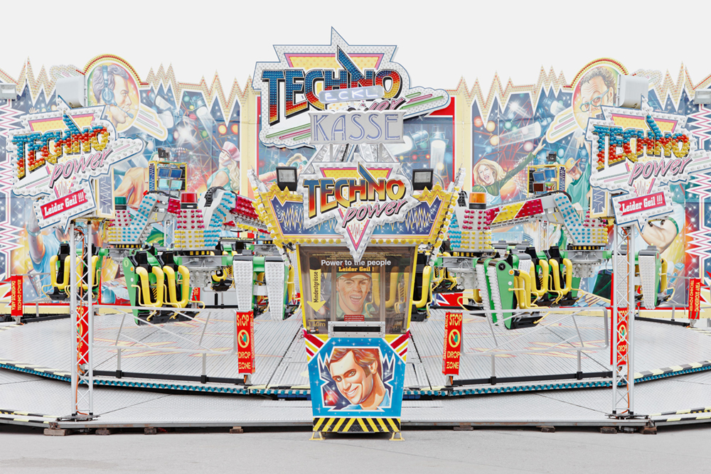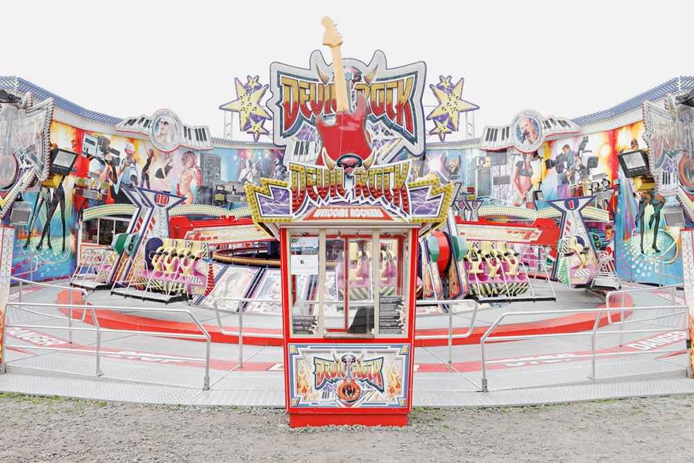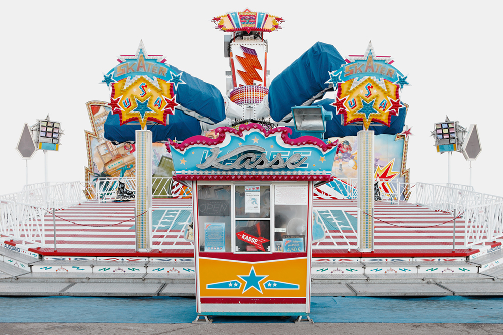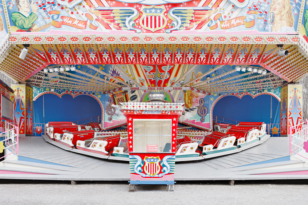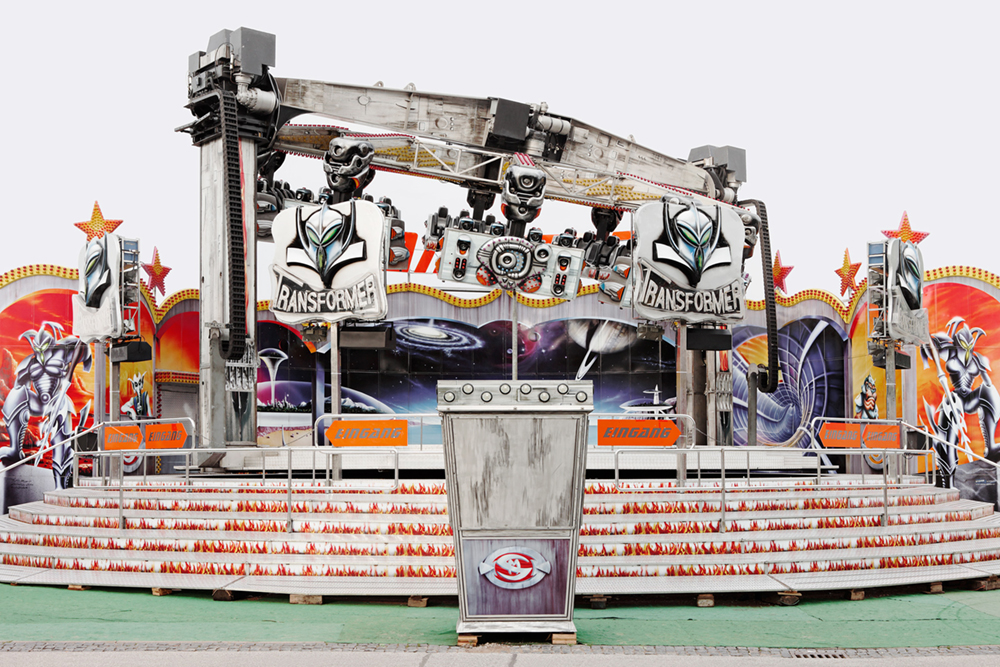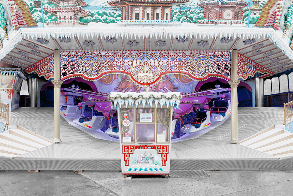 Carousels are exposed and eccentric bodies. They imply sensation and daring, speed and commotion, intense participation and pleasure. In short, they are emotional merry-go-rounds, wholly oriented to the spectacle. Carousel architecture comes in a variety of shapes and designs yet its basic function is always the same. Its individual profiles vie for attention and strive to outdo one another. Photography makes it possible to assemble images of various carousels and set them in relation to one another. The triad of capital (the ticket office), circulation (the hub) and inclusion (the fairground setting)) creates the requisite space for the game of simulation. Germany 2012 – 2014; Pigment Prints 50 cm x 70 cm