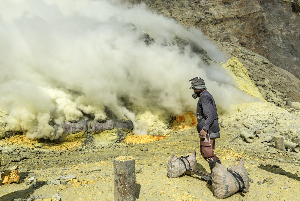 Kawah Ijen is a sulphur emitting volcano in Indonesia.sulphur miner are the local people of Banyuwangi,east java. working here is considered as world's most dangerous job.Miners are paid to collect the molten sulphur ,in order to collect them they have to work long time inside the poisonous smoke .Workers earn around Rp 50,000 - 75,000 ($5.50-$8.30) per day.the toughest part is carrying 80kg of sulphur from bottom to the top of volcano (3000m) where the path is too steep and often covered with poisonous gas .Many Miners don't have enough money to buy mask ,instead they wet some cloth and put them in mouth and breath through that cloth.