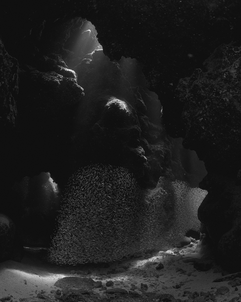 Silversides lighted by the sun in an underwater grotto Devil's Grotto Grand Cayman Cayman Islands