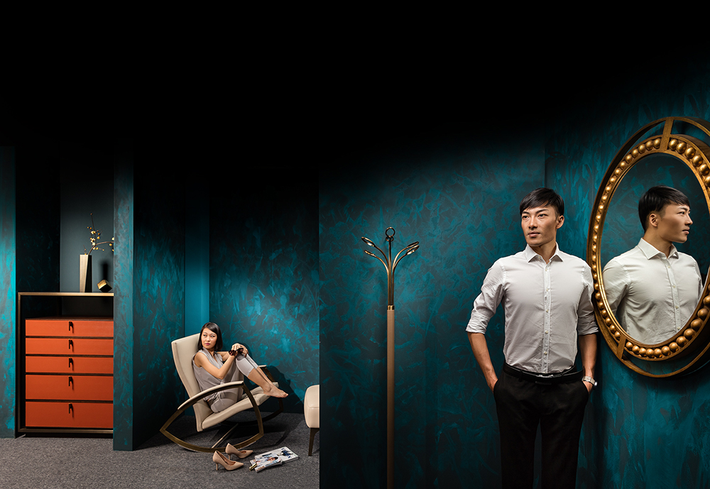 Advertising for a chinese furniture brand company, shooting at the factory in Whenzhou. We built walls, creating a maze structure as background and models interacting with the furniture, creating an oniric landscape. This set is a tribute to my master Eugenio Recuenco
