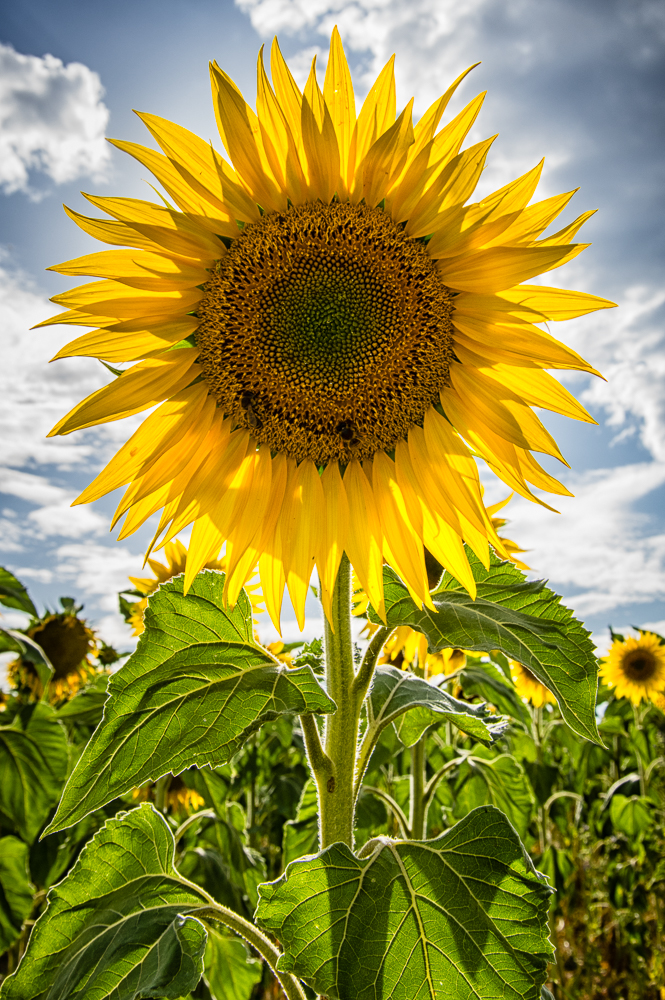 Sunflower directed against sun light shot in a sunflowers field, Provence, France