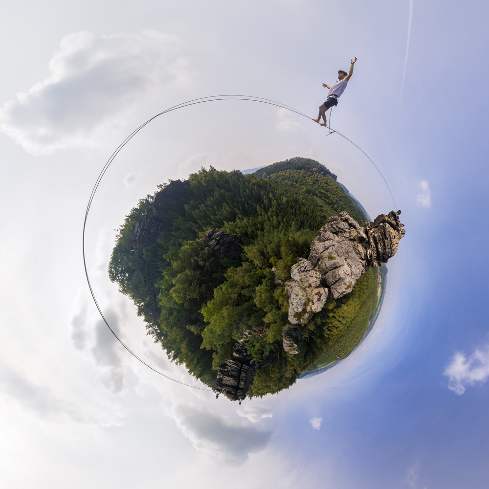 A stereographic projection of a spherical 360 degree panoramic image. It is shot in the Elbe Sandstone Mountains in Saxon Switzerland during a walk on a new established highline called "Rainbow Warrior". The camera was mounted on top of a 10 meter high pole to achieve this perspective.