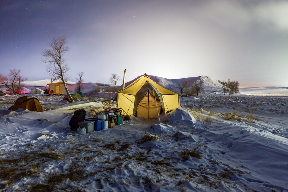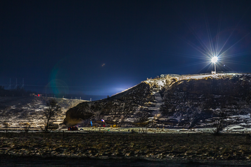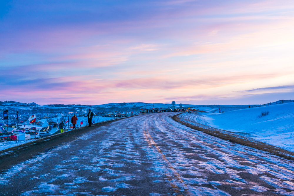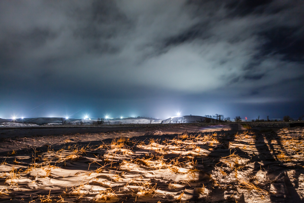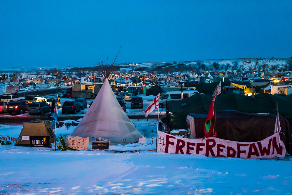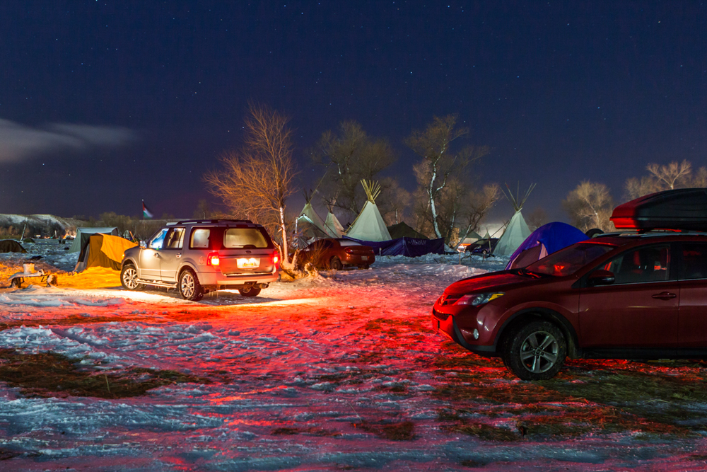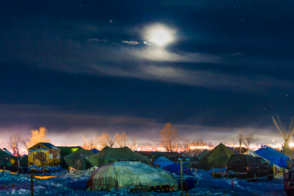 The images in Watershed are of the Oceti Sacowin Camp of Prayer and Ceremony on the edge of the Standing Rock Reservation in North Dakota. The Standing Rock Sioux, which suffered a massacre by the US Army on that land in the 19th century, are once again under siege by the government. This time a private company is running an oil pipeline through land belonging to the Sioux people right through sacred sites and burial grounds belonging to them and directly across the Missouri River just above their reservation, potentially endangering their water supply. They established the ceremonial camp to attempt to block the passage of the pipeline through their land, but the government has brought in a militarized police force along with a private security firm to brutalize the Sioux standing their ground on land they have every legal right to occupy. The police brutality has been well documented by international press, but I chose to focus specifically on the two mile long line of klieg lights brought in to psychologically disrupt the people living in the camp. This disruption of the darkness--the use of lights as a weapon--was of particular interest to me because it served more to illuminate the horror of a government turned against its own citizens than to disrupt this improvisational city which had blossomed to over ten thousand inhabitants on this weekend in December, 2016 when these images were taken. The lights illuminate the bizarre convergence of the past and the present--with images of tipis and suburban mini vans side-by side. They also create the specter of a potential totalitarian future with images of razor wire and klieg lights wrapped around a burial mound.