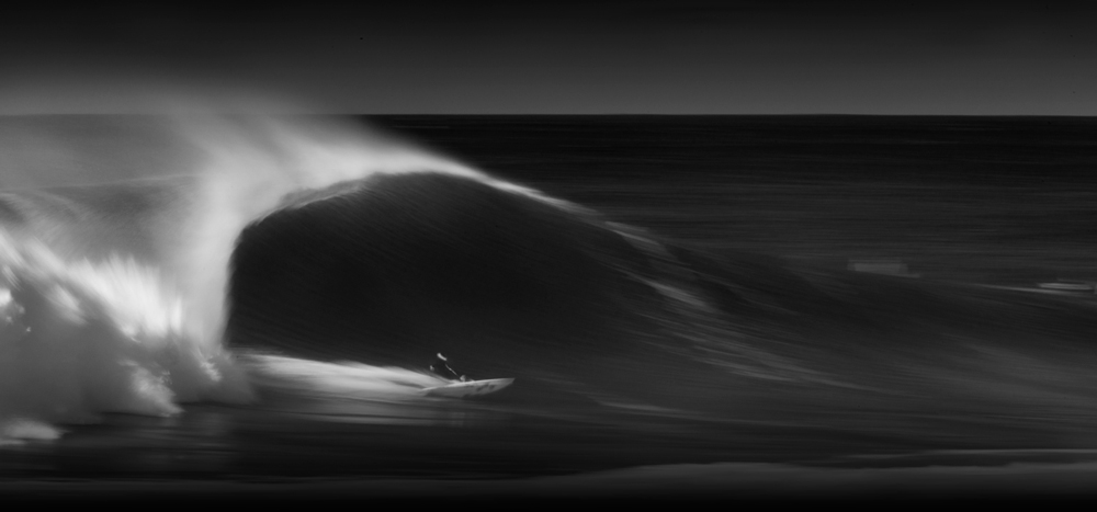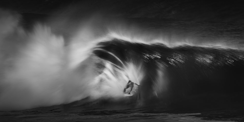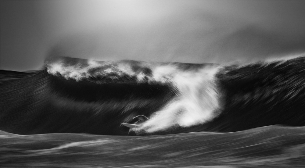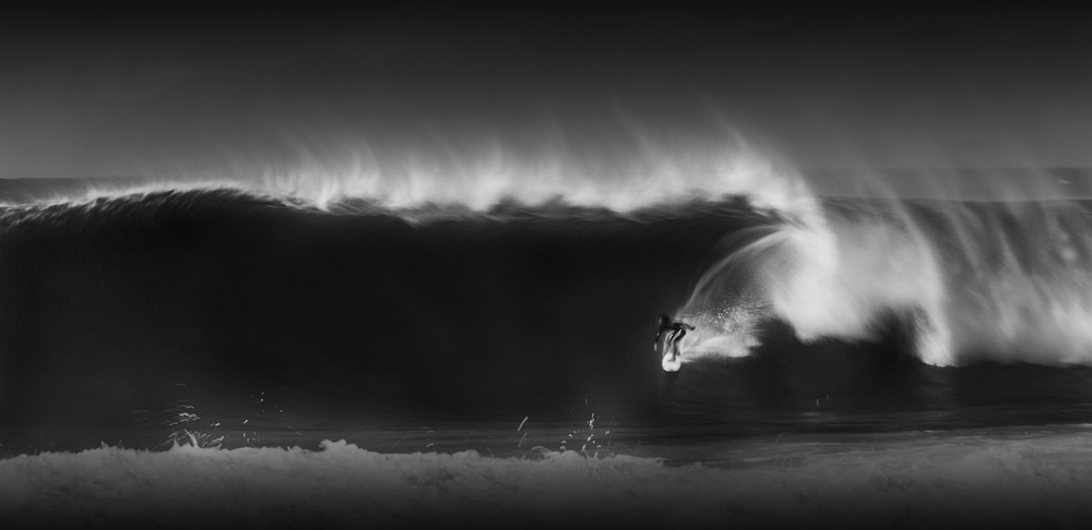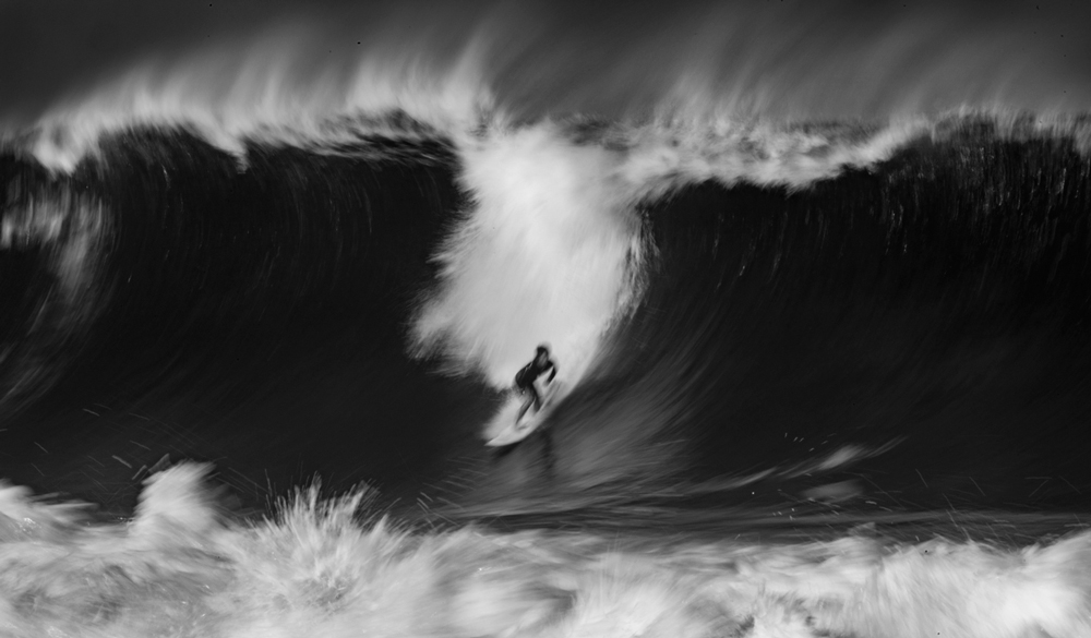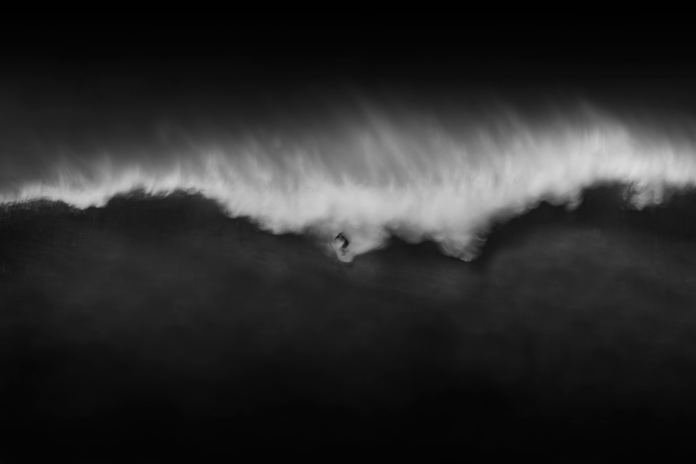 In my photographs for Unforgiving Surf, I want to show that extended moment when a surfer fuses with a wave and takes on a more iconic stature. There is certainly beauty in the arc and flow and spray of the water and the intimate way a surfer holds to all that. Or touches a wave once in the barrel as if an energizing life force. Of course the rough and tumble truth of a surfer’s life is the many hours they spend bitter cold and scrambling to stay alive. Catching a big wave at the wrong moment can slam a surfer down into the blackest depths. But catching it at the right moment can lead to glory. In my photographs, I try to find surfers who are just hanging on, barely, to that glorious edge.