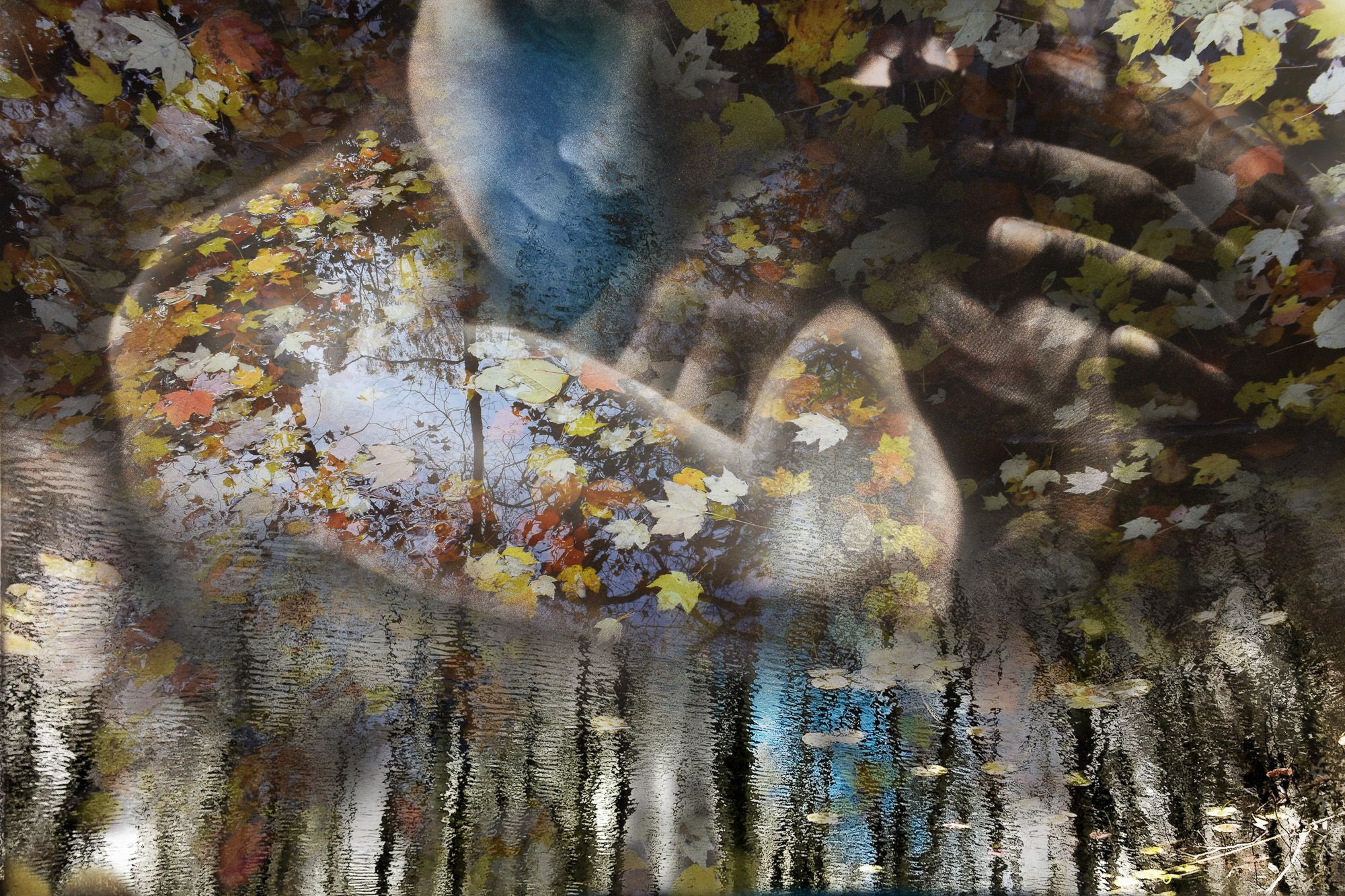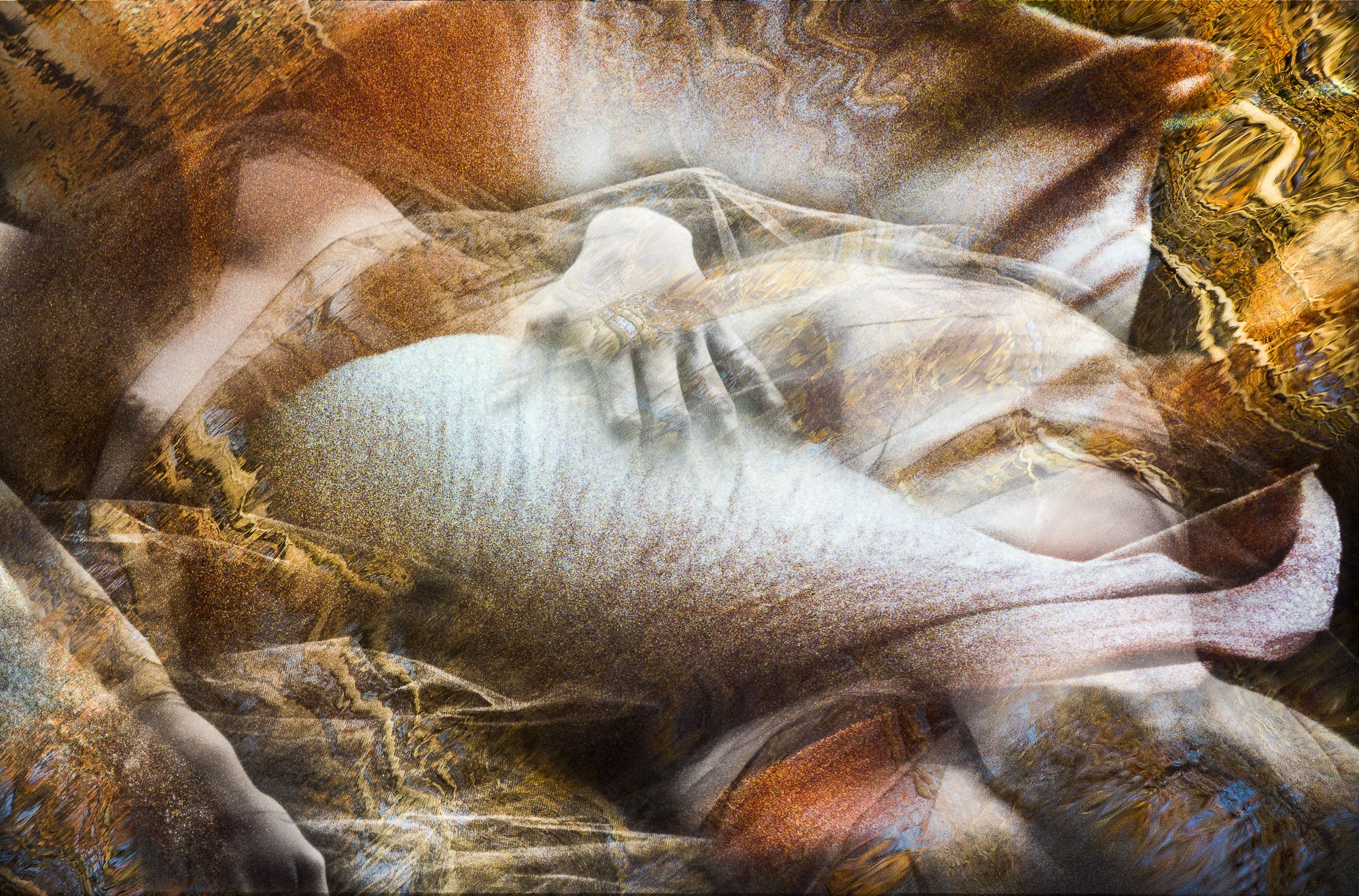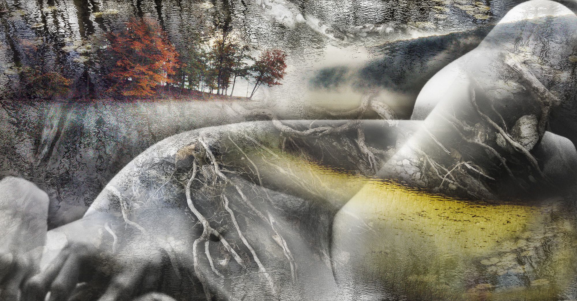 Dreamlike landscapes by combining the human form with multiple organic elements. They are “like the strata of memories. The mirrored surface of water reflects skylight into a hidden hollow, revealing something new, yet familiar. The patterns of leaves or sedimentary rocks rocks naturally suggest intricate tattoos. These compositional layers of elements give the viewer reason to look closer, to see beneath the surface. The interplay between the human form, organic elements, and the landscape create incredible beauty for me, as they are intertwined on earth, coexisting as one.