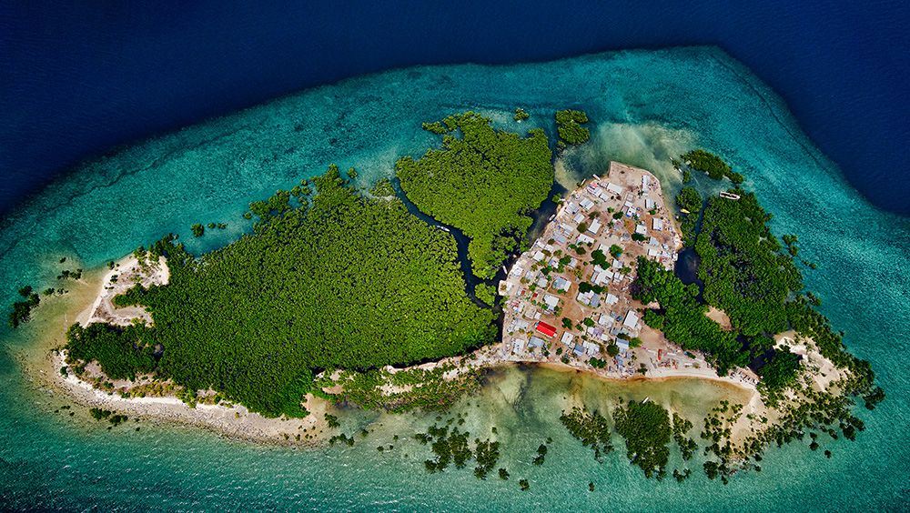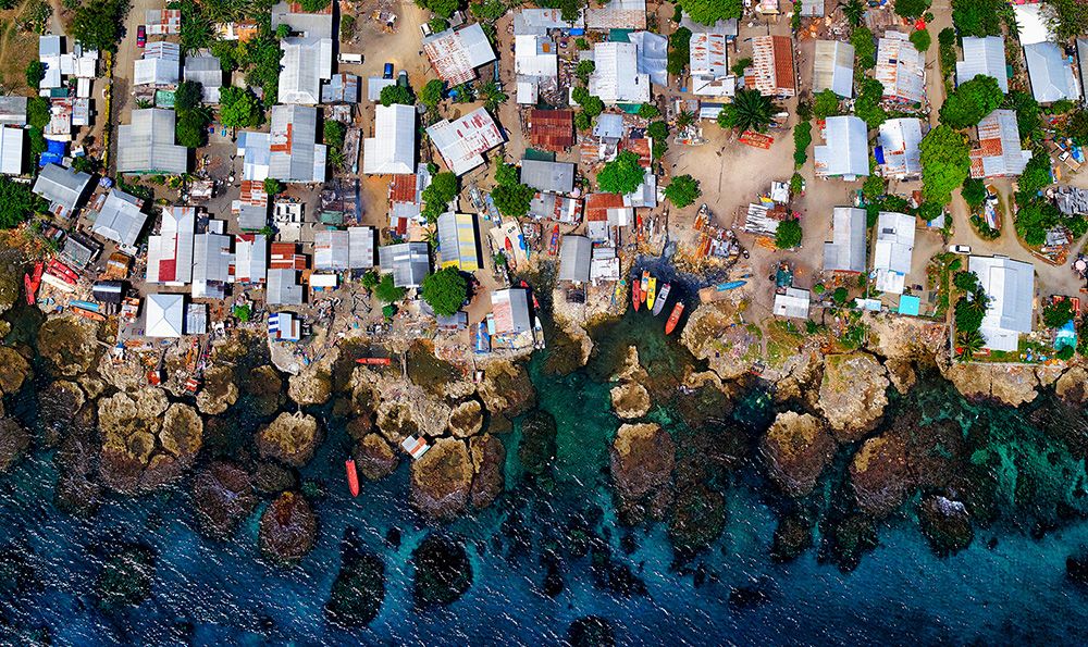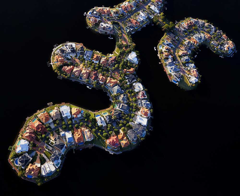 These images are part of an ongoing project to record aerial images of human settlement patterns at the edge of water. Most of these are at the ocean’s edge. Humans have a fascination or a compelling need to live at the interface of land a water in its different forms. For villages in the developing world this includes the need to be near the sea where they can fish for livelihoods and sustenance. For developed societies it means a lifestyle choice, often for the rich, or the opportunity for holidays in exotic locations.