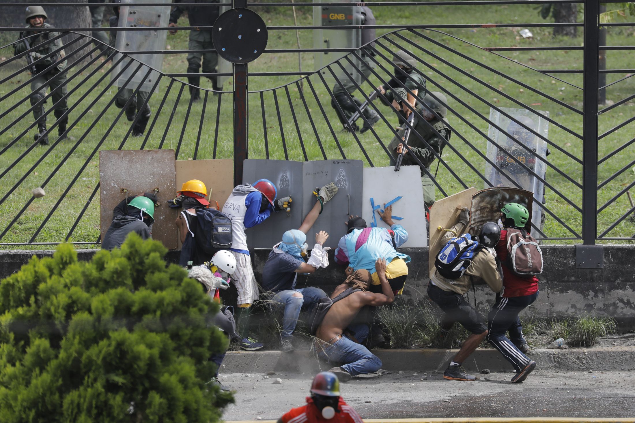 Demonstrators clash with riot security forces at the fence of an air base while rallying against Venezuela's President Nicolas Maduro in Caracas, Venezuela