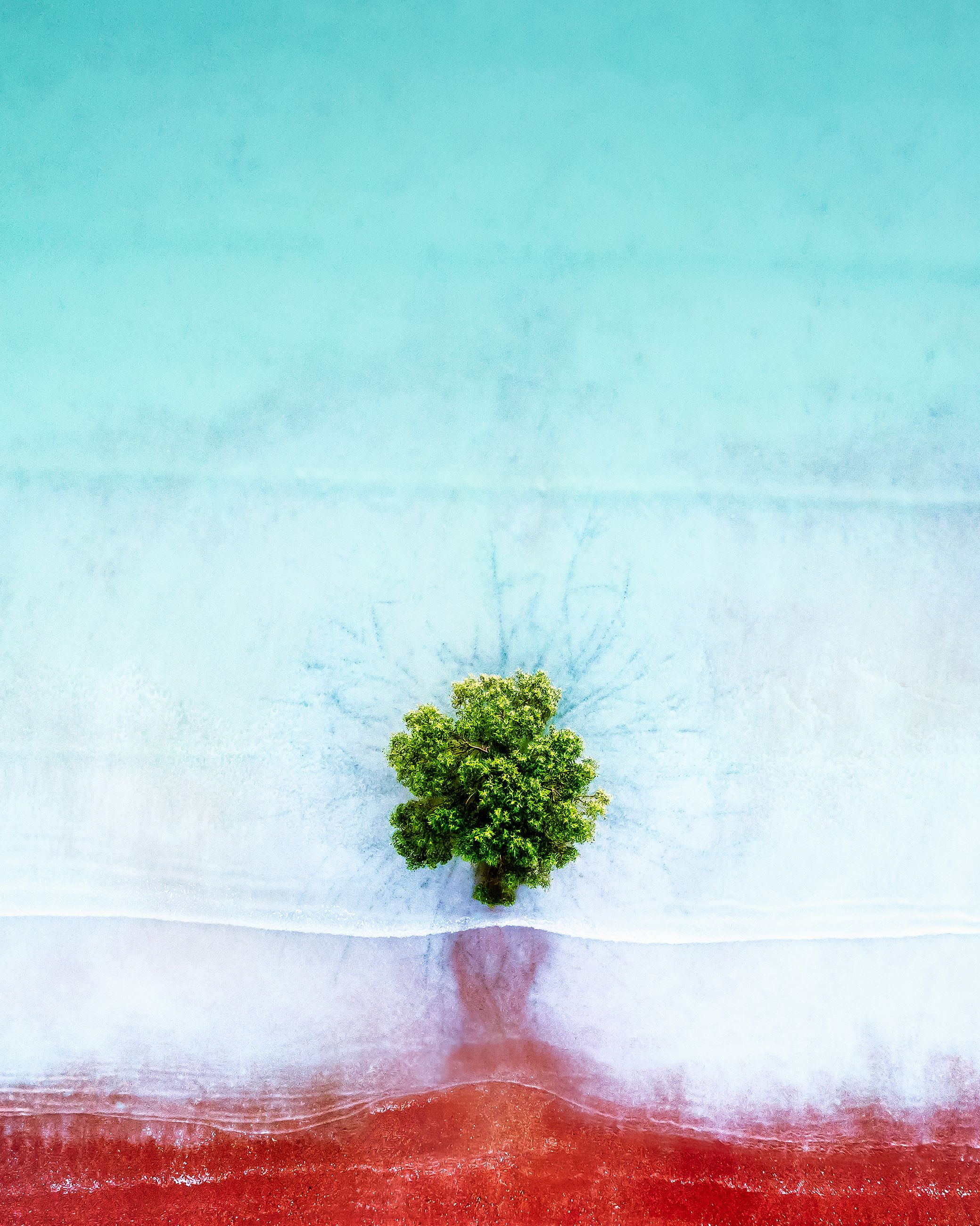 The shoreline along Roebuck Bay in the Kimberley region of Western Australia has deep red 'pindan' cliffs that meet the ocean. The mudflats are home to mangroves that are scattered along the shore of this ecologically rich environment. The red ochre 'pindan' produced from the cliff faces also make up the 'beach' in this unique area, providing a striking contrast of colour when viewed from above.