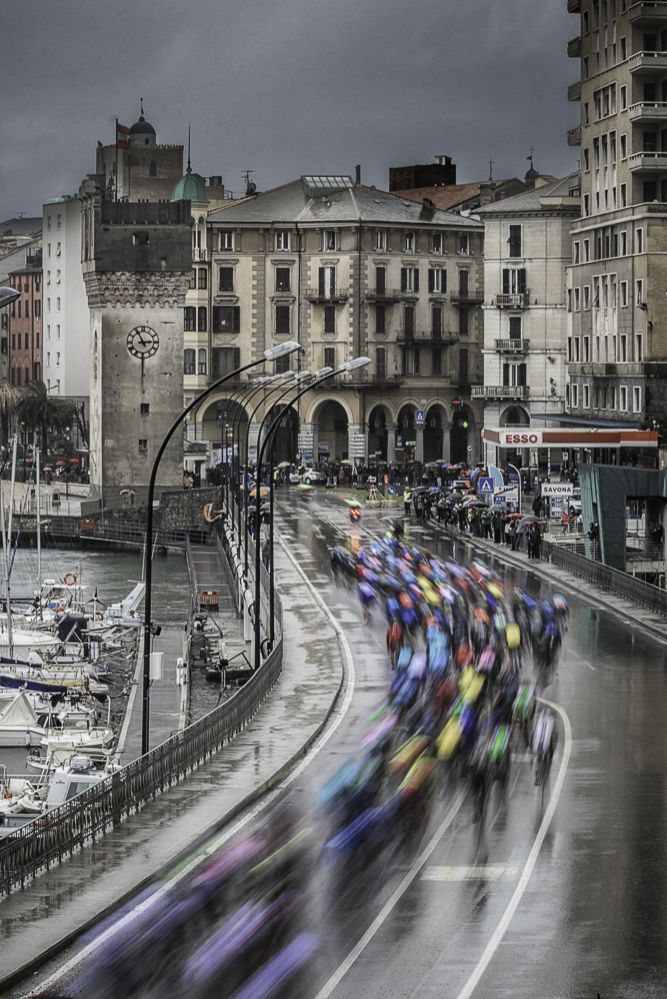 Come tutti gli anni, la "classica" gara ciclistica di primavera, Milano-Sanremo, passa da Savona e questa volta ho voluto fermare in uno scatto la corsa del gruppo all'inseguimento dei fuggitivi. Una giornata umida e piovosa ha caratterizzato la gara che poi è stata vinta dall'italiano Vincenzo Nibali. La scia dei corridori entra nella città a piena velocità e passa sotto "la torretta", simbolo di Savona, i colori delle maglie danno un senso futuristico in un ambiente storico.