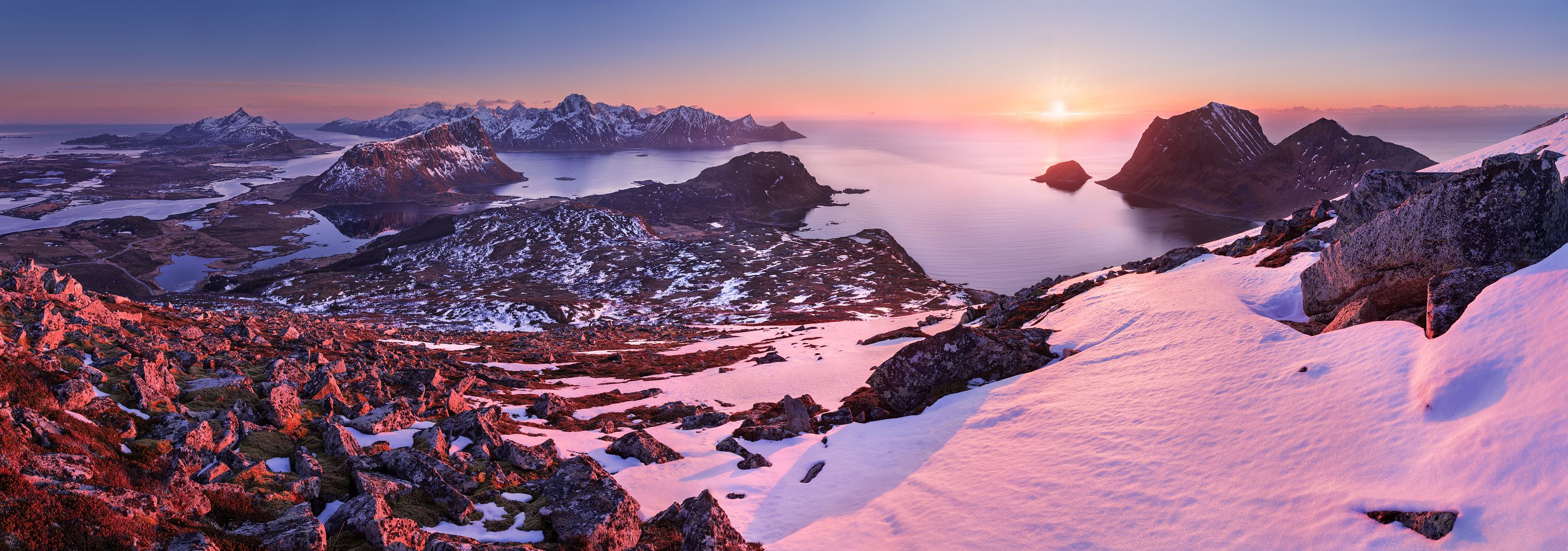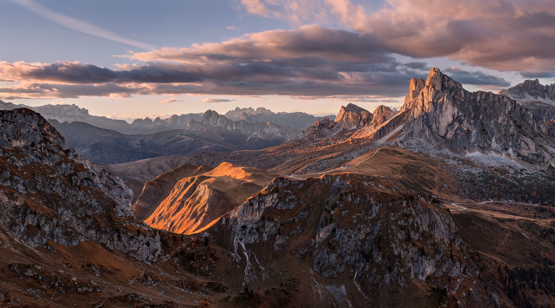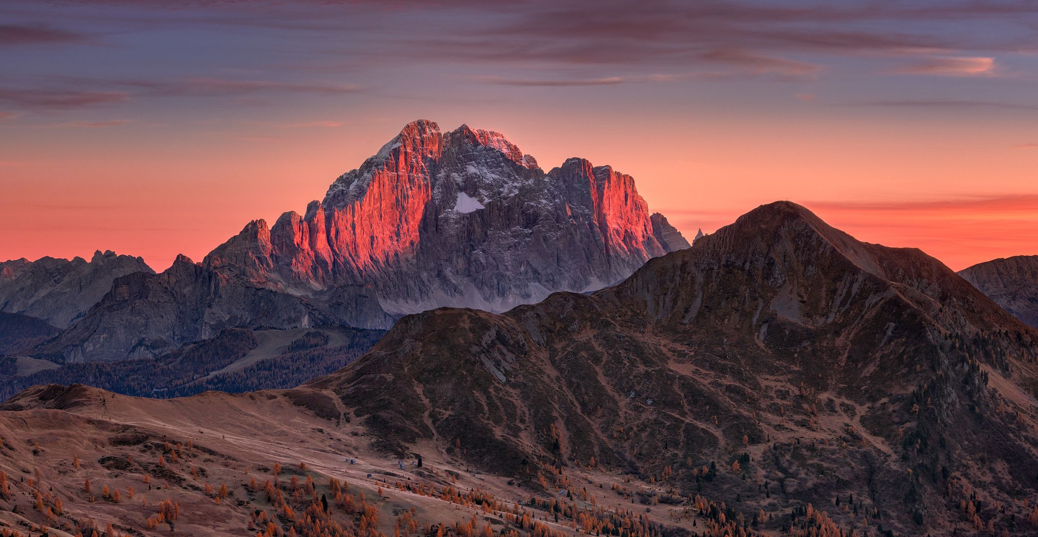A series of panoramic images shows various forms of mountain peaks at sunset time and during different seasons.