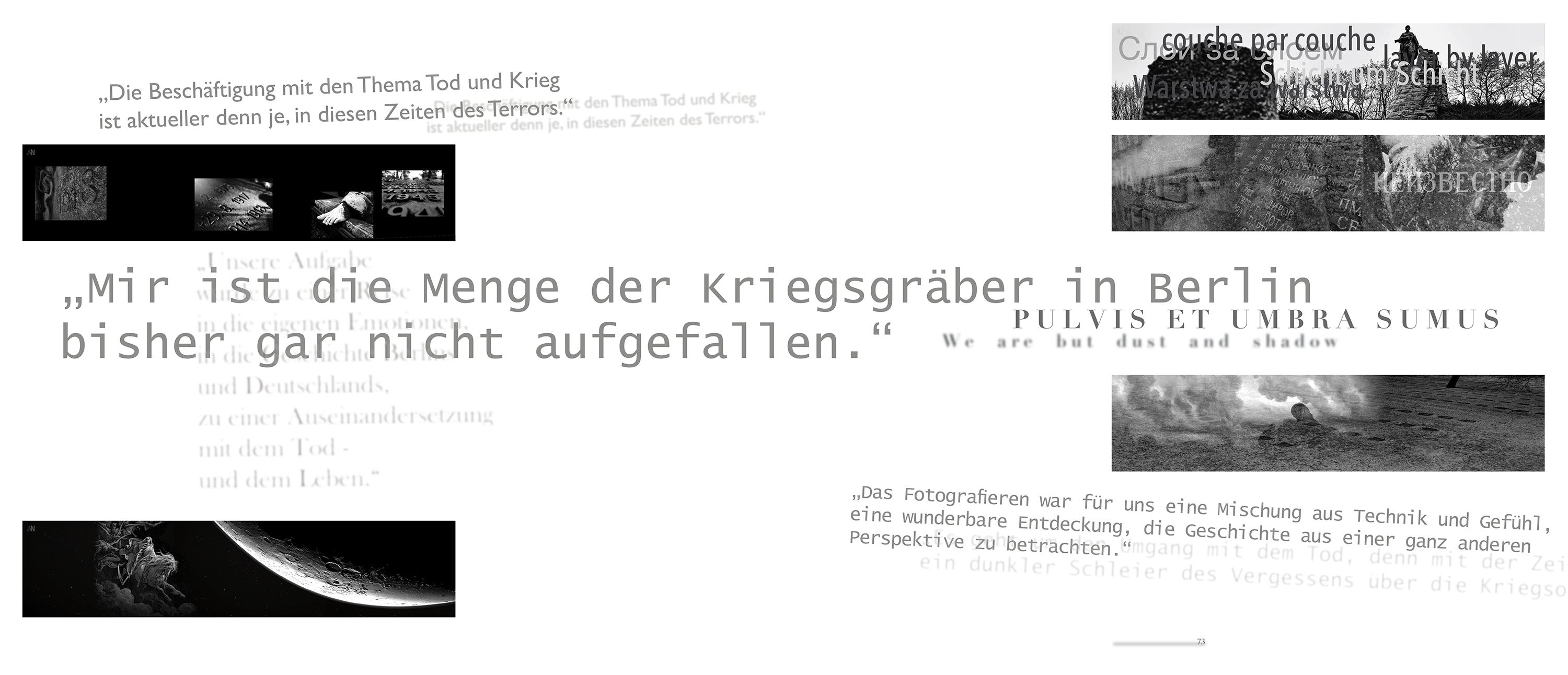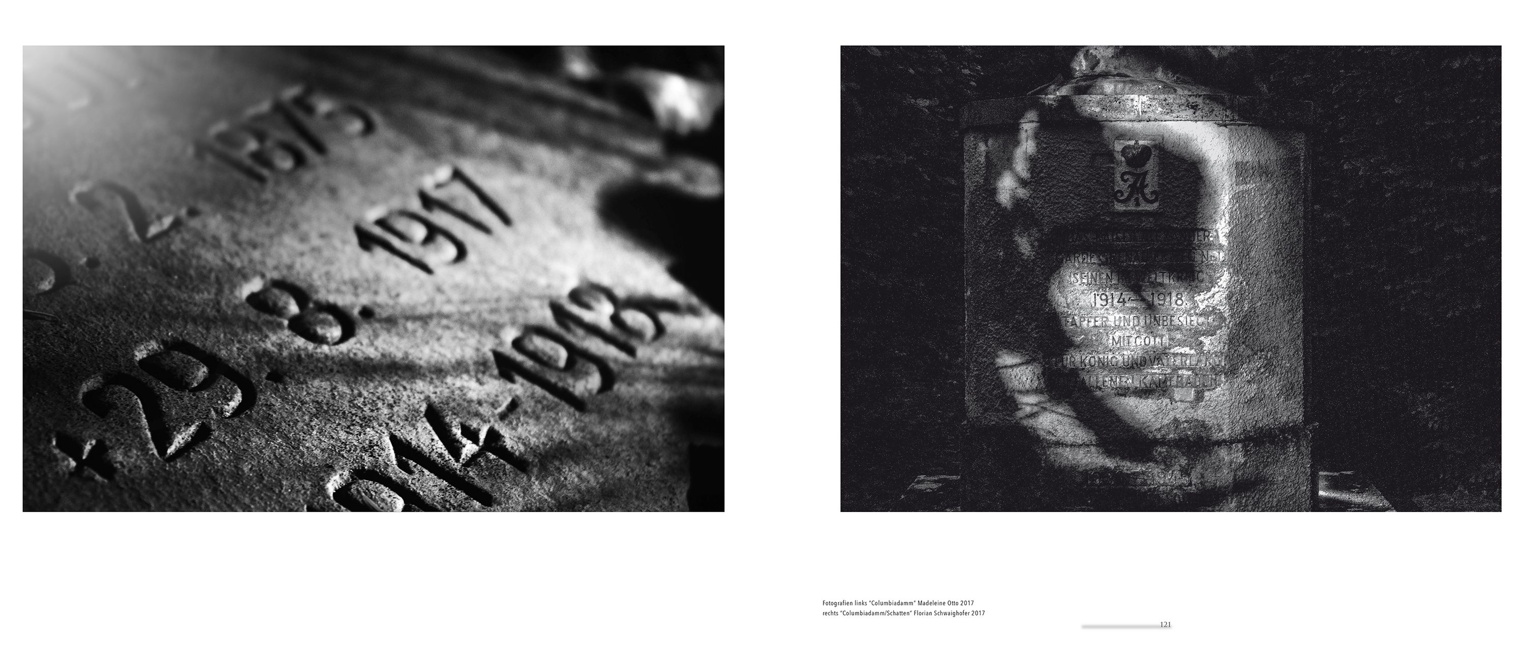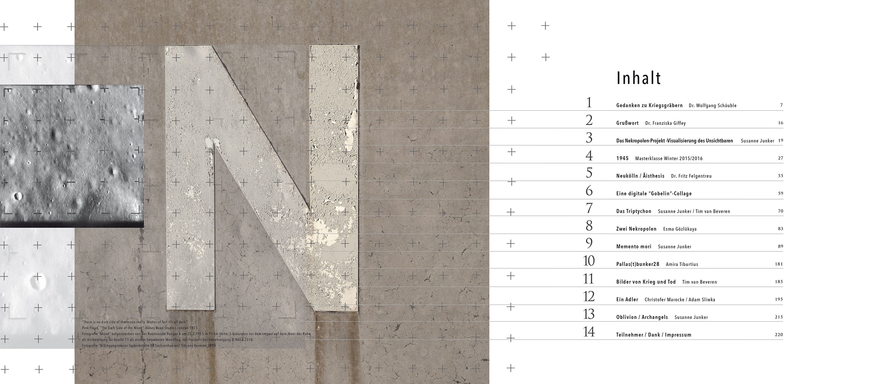 A necropolis is a city of the dead in antiquity. In Berlin of today there are about 220 burial places for the victims of war and tyranny - a modern necropolis with frighteningly many mass graves as an urban layer in the midst of daily life. Many people have no grave at all: the victims of the Shoah. The necropolis project researches the visualization of conflicts, war, atrocities, destruction and death with various media such as photography, digital graphics, film, literature, to digital collages and installations - Troja, Napoleon, 1918, 1945, 2018... The book: 228 pages, 488 images, Blurb