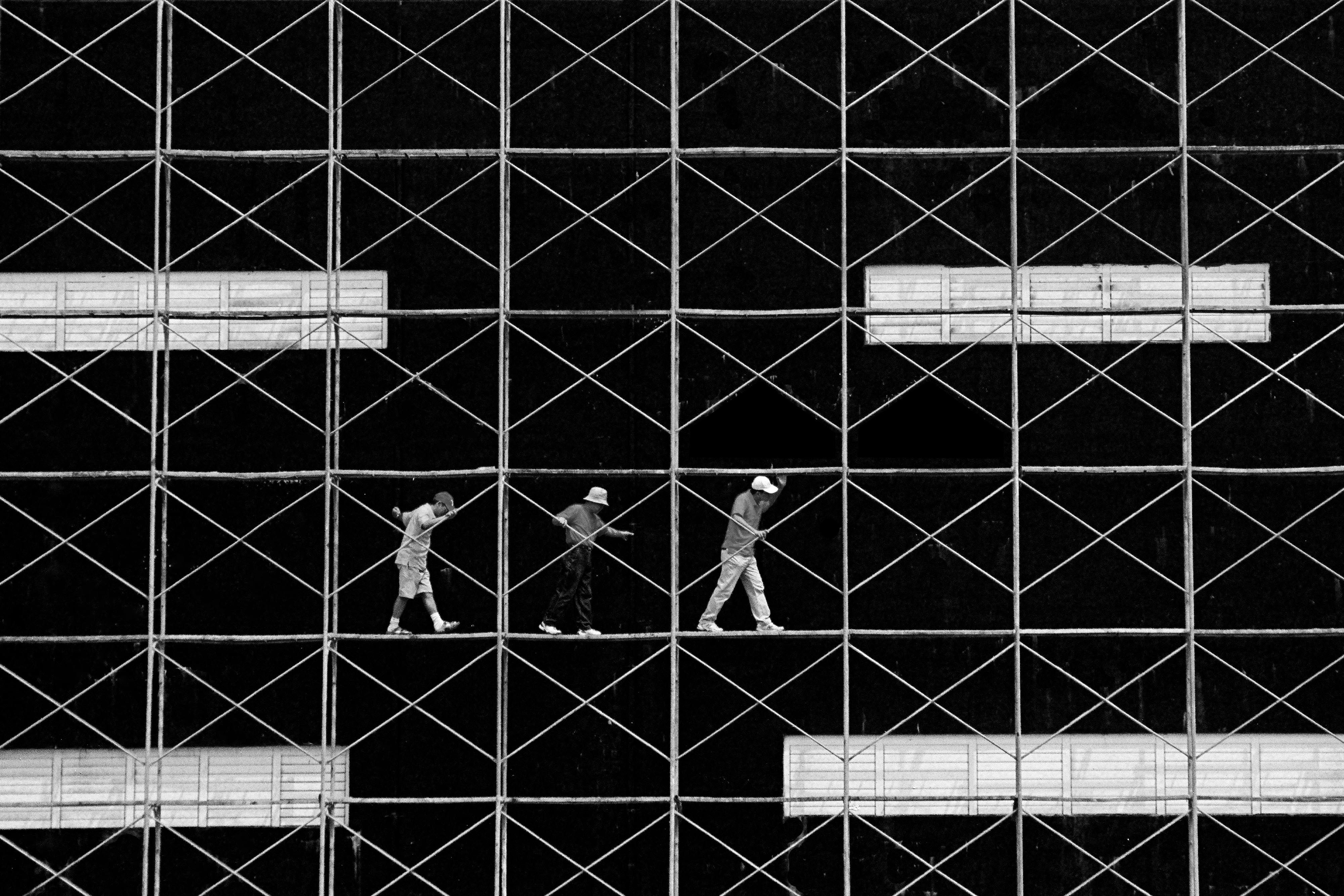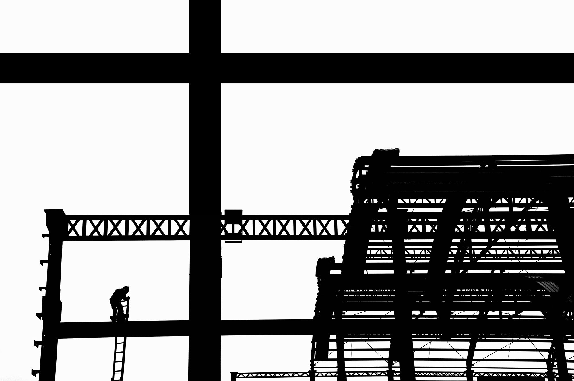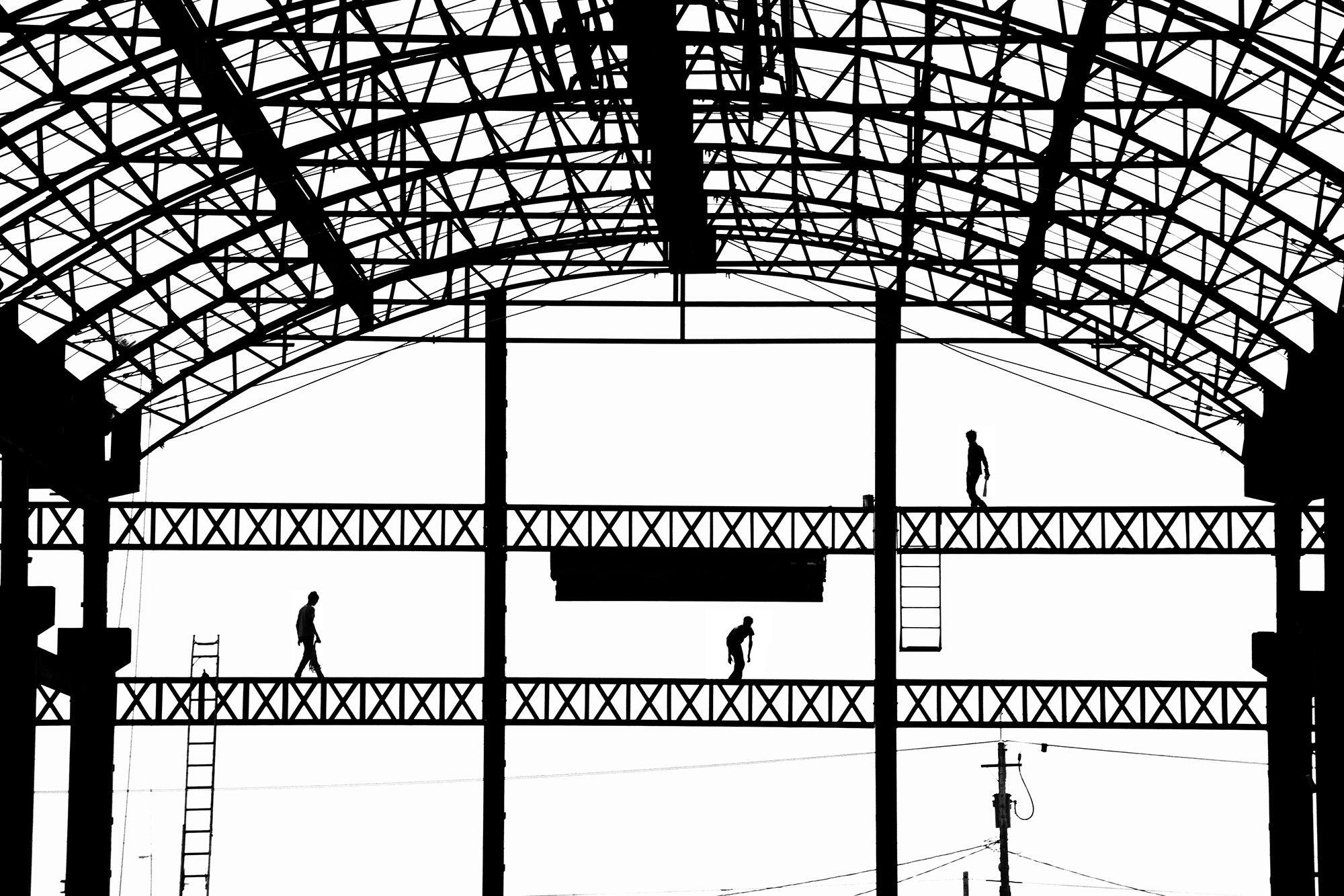 When I creat the series, “Rhythm on the shelf”, I attempt to find some uniqueness and sense of artistic of the structure while it is under construction. In this series, I consider scaffolding, reinforcing bars and steels as strings and stave.I take the workers on shelf as musical note.The whole series shows the view with high contrast and surreal.