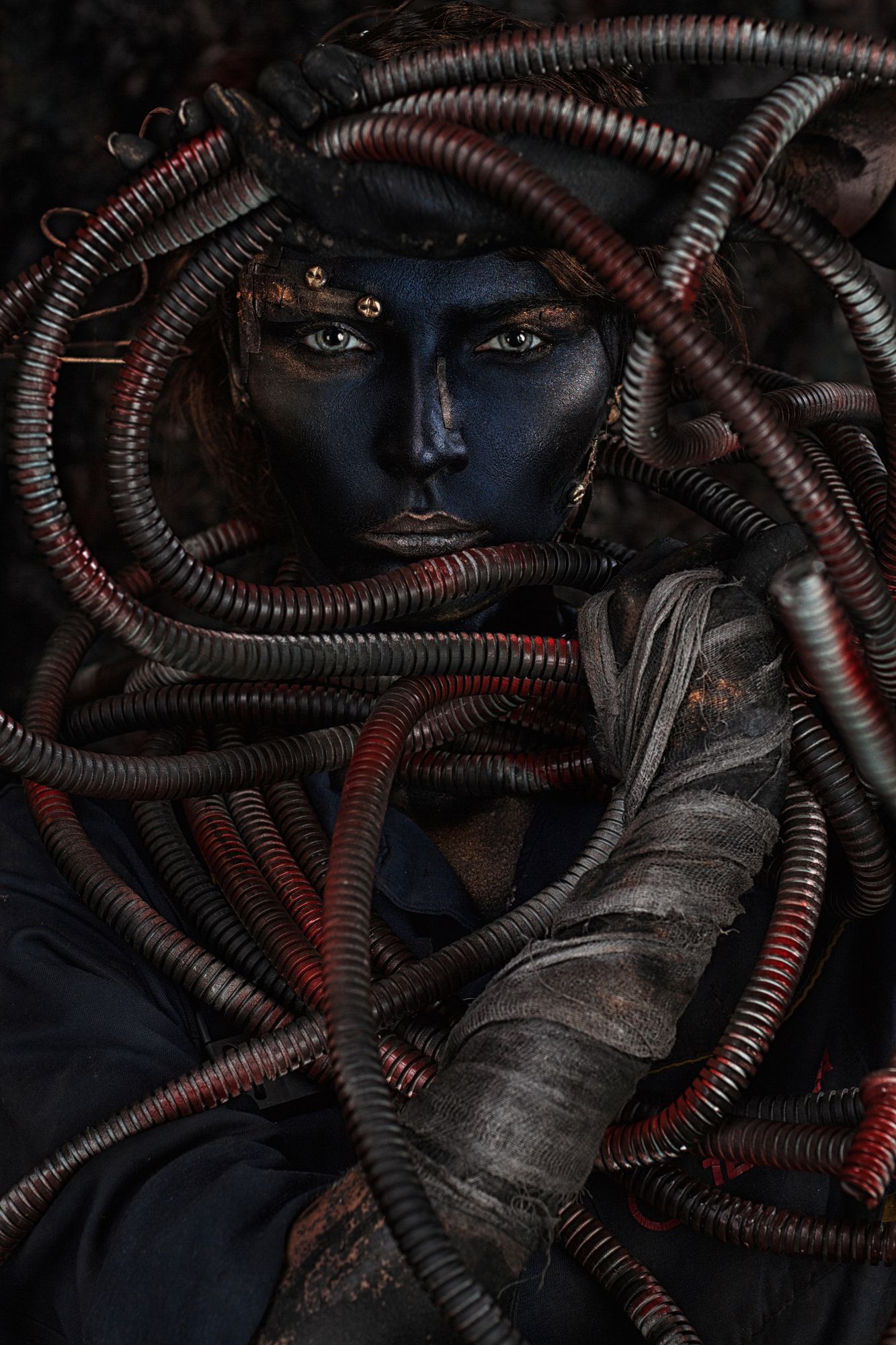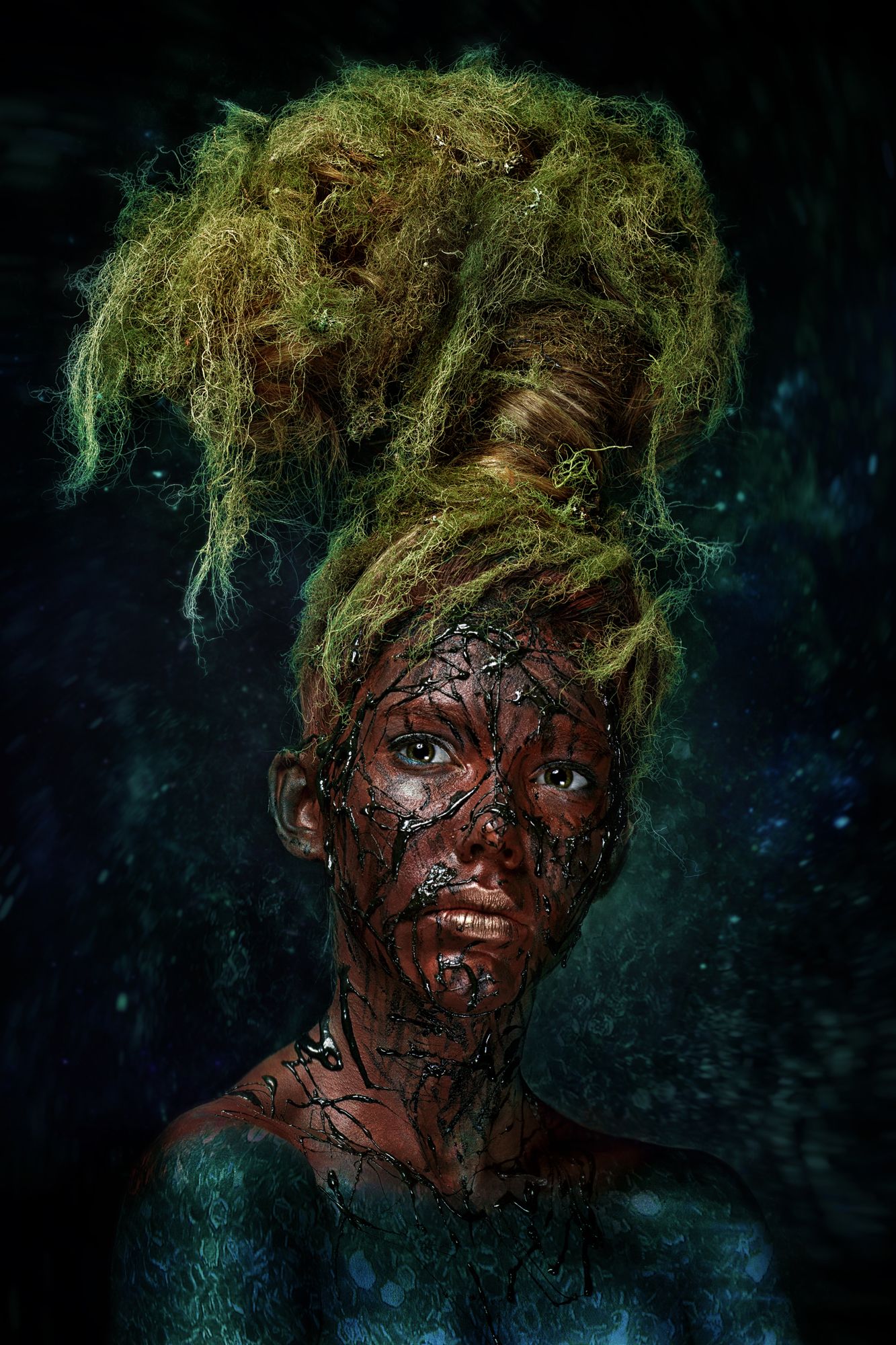 I work together with a makeup artist and hair stylist. Together we implement a variety of ideas. Our works are fiction, a flight of fancy. Sometimes we want to draw a solar eclipse on a person, sometimes to create an image that will reflects the problem of ecology or human weakness. For us, these experiments are very interesting.
