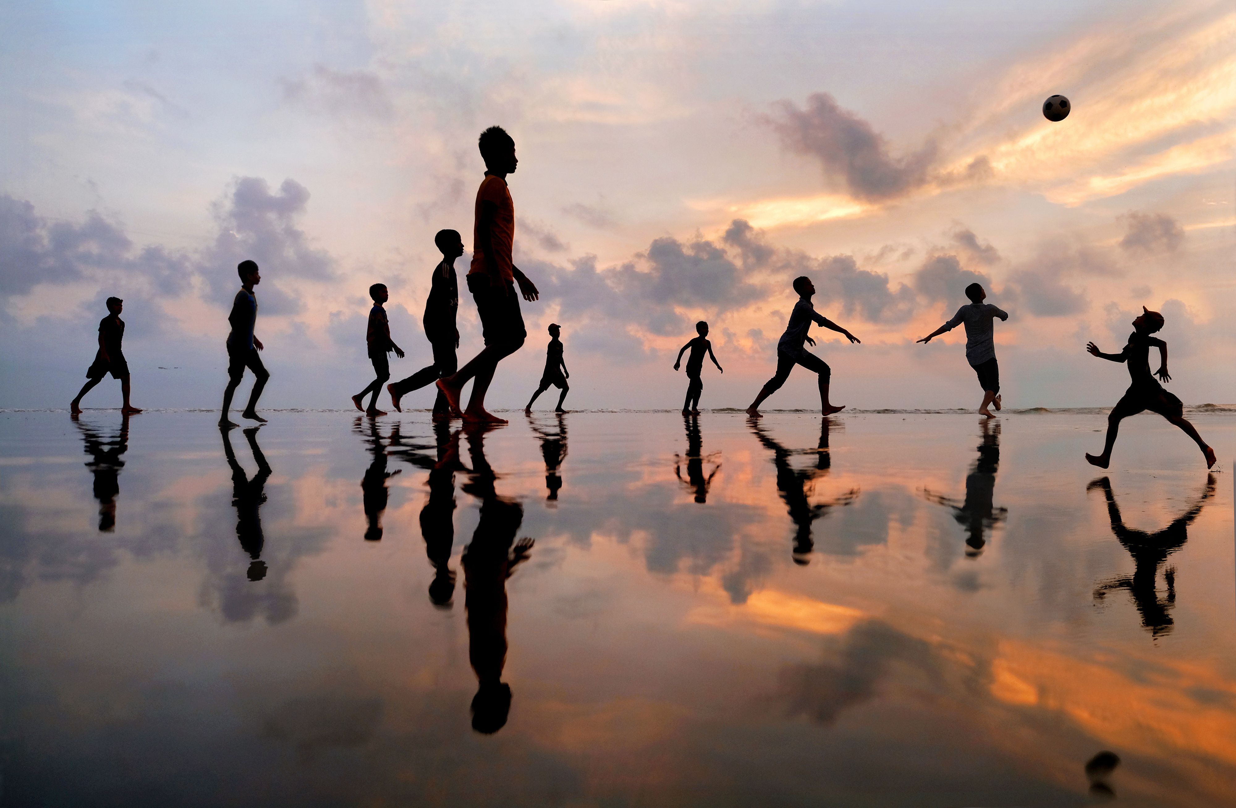 Children playing football at world longest sea beach Cox`s bazar,Bangladesh