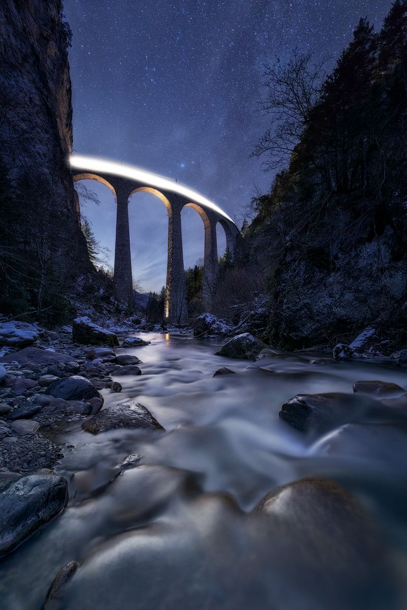 Night train of the Rhaetian Railway crosses the famous UNESCO World Heritage Landwasser viaduct, a single-track six-arched curved limestone railway bridge in Switzerland.