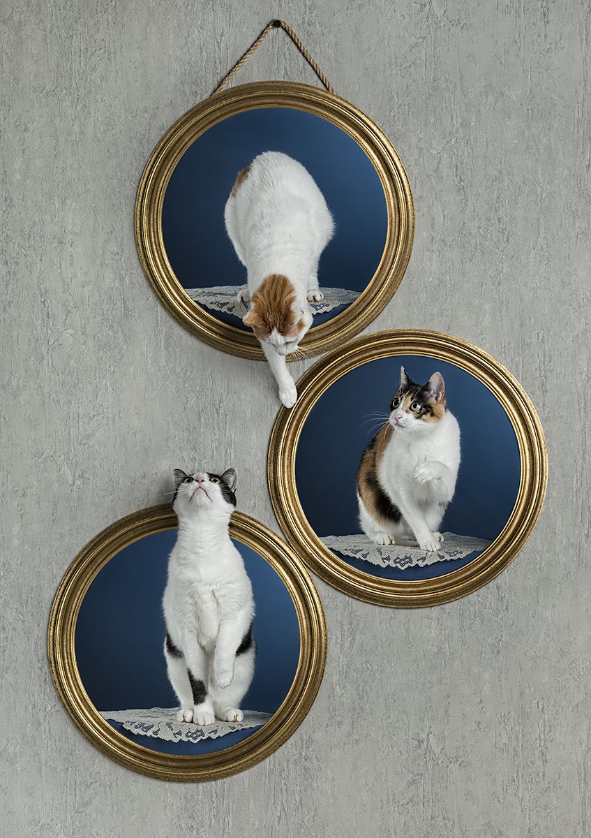 A conceptual image of three pictures on a wall, each with a cat interacting with each other while in and out of the frame.