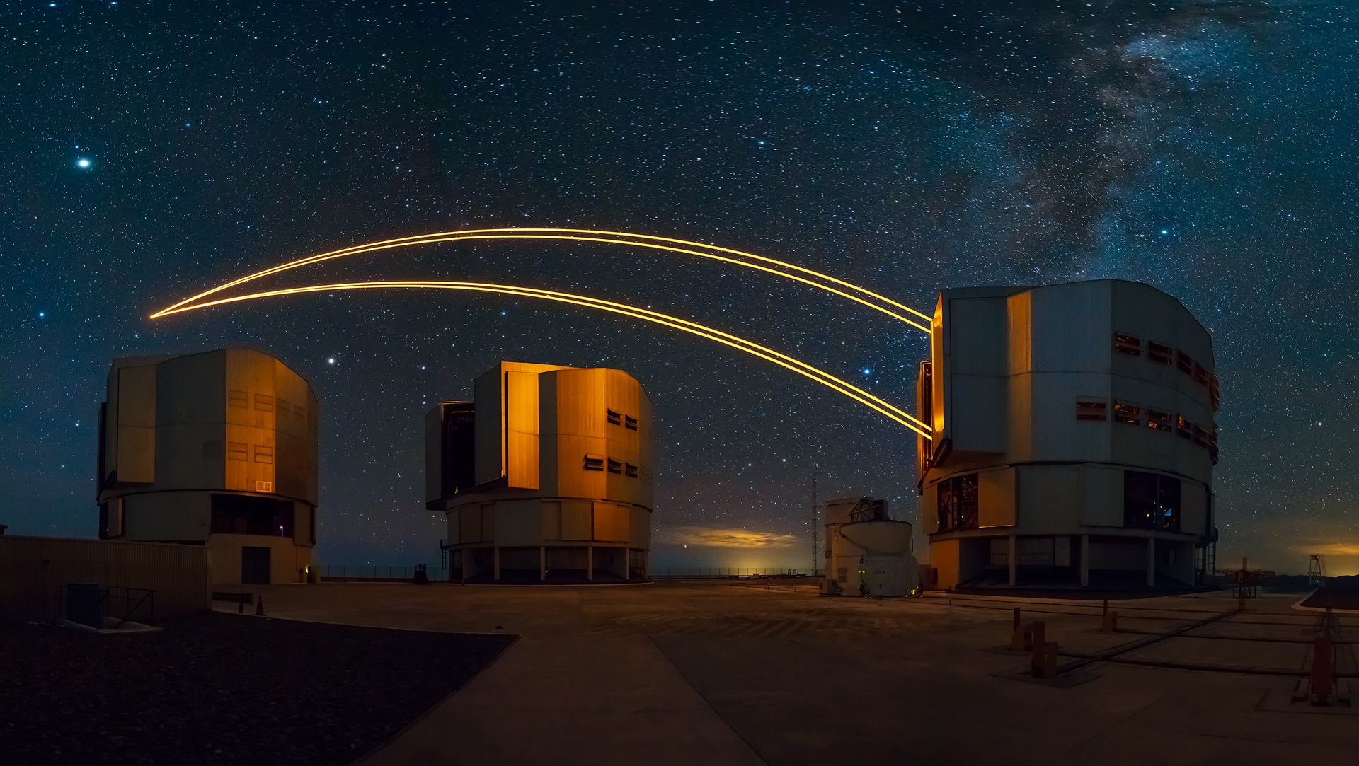Lasers and VLT telescopes in action, this is the Paranal observatory, the largest astronomical observatory and these are the most powerful lasers in the world and reach up to 90 km of distance