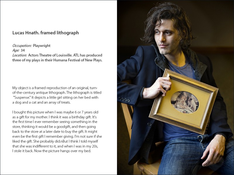 Here is the statement about my project: Objects hold stories, power and history, not only of themselves, but also of the people who hold onto them, through years, relocations, losses and gains. In this series I am photographing a wide range of people, each holding the object of personal significance. These objects, and their relationship to the people who possess them, reveal insights into their surrounded socioeconomic and cultural contexts. Additionally, the presence of the individual's chosen object immediately deepens the viewer's experience of the subject, and brings forth intimate intimate information that would not be forthcoming in a traditional portrait. The portraits are taken in a personal space, at home, workplace, a favorite hang out, or any other place meaningful to the subject of the photograph. As part of the series, each subject writes about their objects, I have included a few examples.