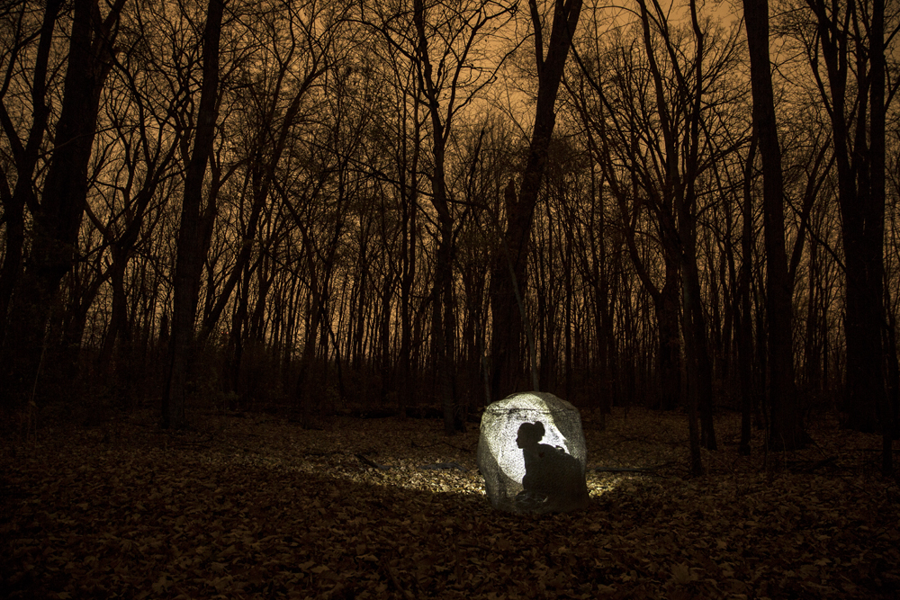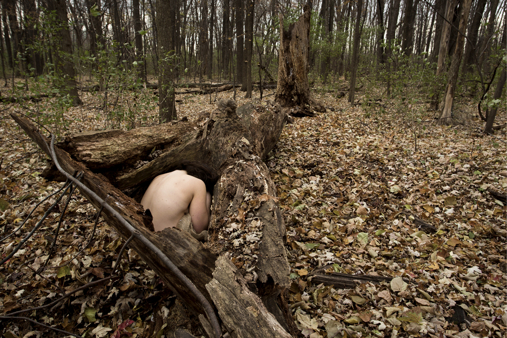 My grandparents’ stories of hiding and survival in the forest during the Holocaust are crowded with suspicious characters as well as saviors and protectors. These characters took on the forms of trees and woodsheds, rifles and swamps. The site of the forest carries a charged and multi-layered history; it called on both of my grandparents and many other survivors to perform dangerous feats, while also sheltering them from terror and death. “Don’t Let Me Go (Let Me Stay Here)†is a personal exploration into the worlds that I imagine they may have inhabited. Using the forest as a character within the narrative of each image, I attempt to create fragmented scenes that depict strength and vulnerability, hiding and confrontation. Just as the process of remembering and speaking about trauma can at times be disorderly, the images in the series are not meant to fit into a clear or linear description. I constructed these scenes from the position of someone who is both inside and outside of this traumatized history, inserting myself into the landscape of my grandparents’ memories, while remaining cognizant of the fact that this insertion is a performative act. Although the feelings involved in the act of constructing and performing this history are intimate and embodied, they remain tied to a reality that is worlds away and impossible to truly know.