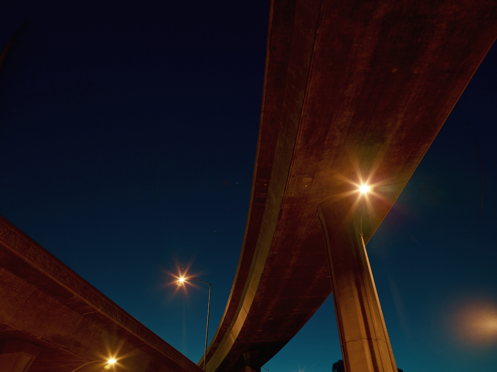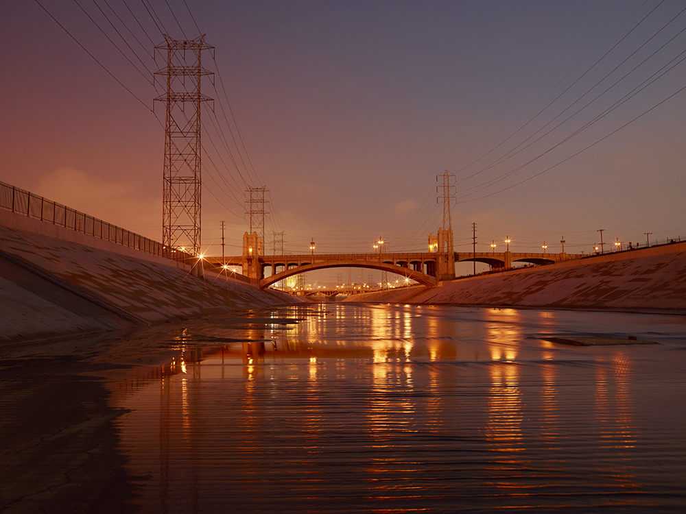 LA River One of the reasons I was drawn to these locations is the shear scale of them. In Los Angeles they have concrete lined pretty much all of their river and drainage systems. Some of these river beds, known as the LA River, can be up to 100 meters wide and 20 meters deep and many miles long. Roads and freeways are built over them using concrete again. While I was there I saw a new section of an elevated freeway being built and was amazed to see that it comes in kit form. Pre-cast, delivered on the back of flat bed lorries and then craned into position. These brutalist forms transform the landscape and take over the environment almost like they’ve been built by an ancient race for another purpose. I wanted to capture them at dawn when the light draws a different perspective to them and for people to gain their own narrative.