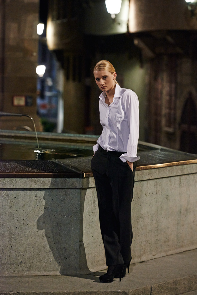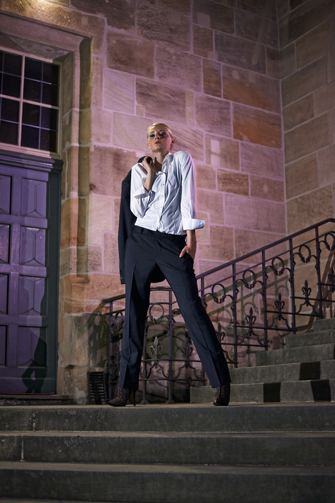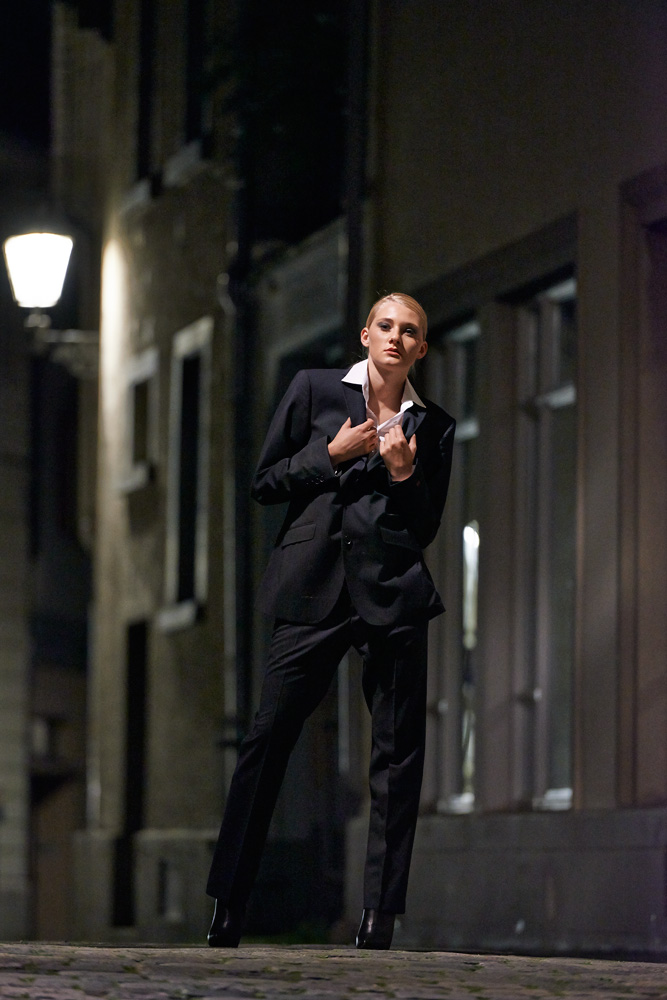 A young female model wearing men's suits in an old town location - I love the mood of these contrasts and colours.