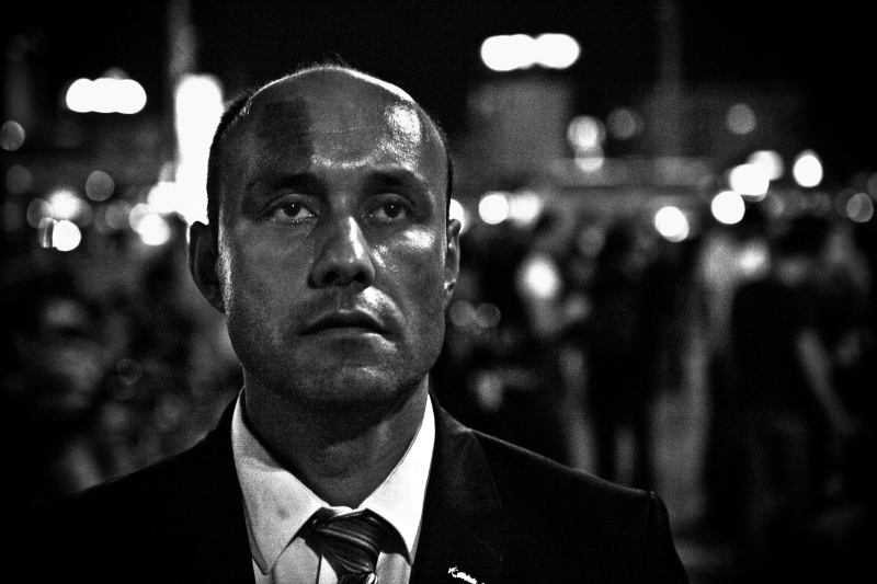 Protests started in Turkey on 28 May 2013. The protests were sparked by outrage at a brutal eviction of a sit in at Istanbul's Taksim Gezi Park protesting the park's demolition. Subsequently, supporting protests and strikes took place across Turkey protesting a wide range of concerns, at the core of which were issues of freedom of the press, freedom of expression, freedom of assembly, and the government's encroachment on Turkey's secularism. The series represents the “standing man†protest, a type of dilemma action: simply standing in Taksim Square for hours, staring at the Turkish flags on the Ataturk Cultural Center.