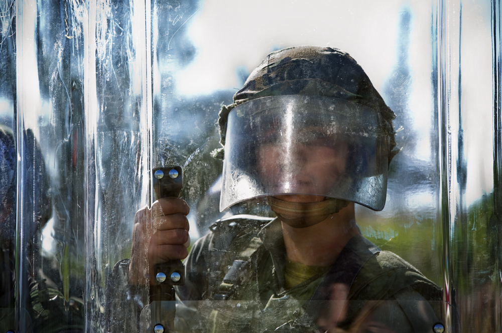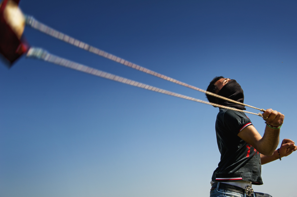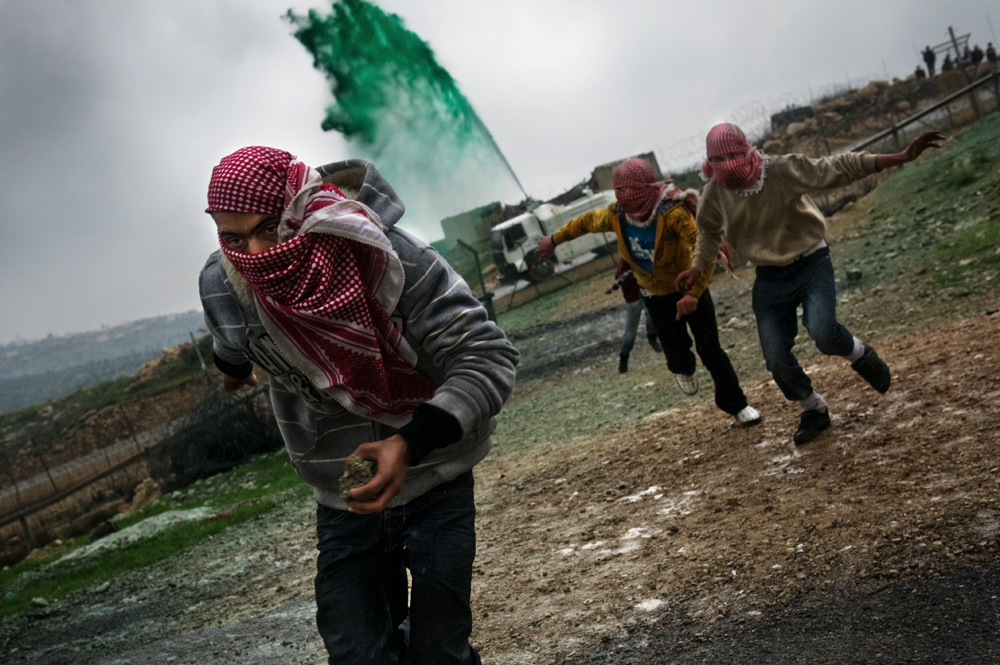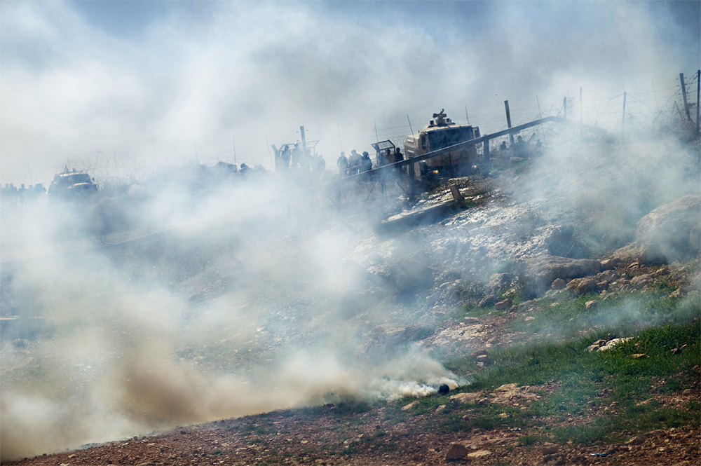 Popular resistance in the Palestinian village Bil'in close to Ramallah. Palestinians, joint by israeli and international activists demonstrate every week against the wall crossing their land. About 60% of the villages land lied behind the fence, before it got dismantled and rebuilt closer to the israeli settlements in 2011.