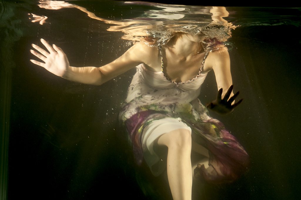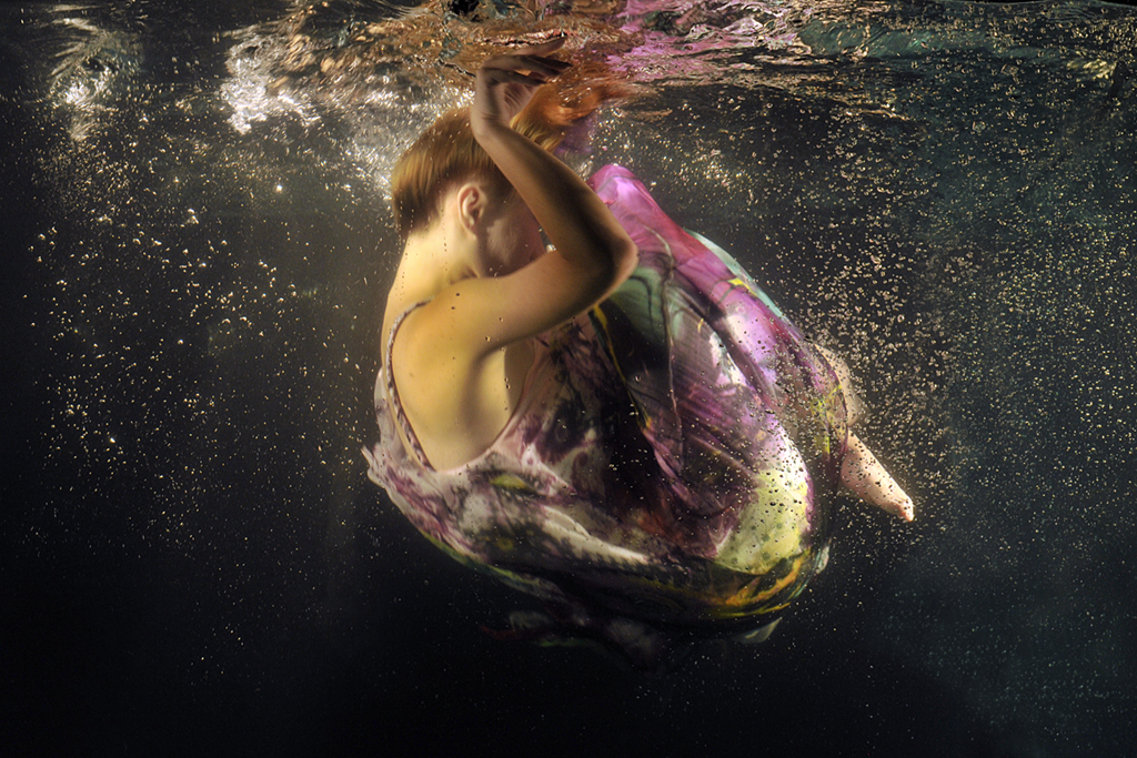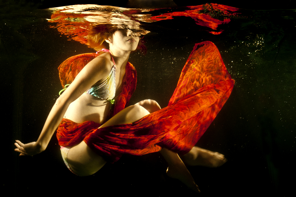 These photos were taken underwater, with illumination composed of 6 artificial lights used for movie shooting . It took a lot of efforts to make experiments on the lighting effect. To make the differentiation from the often seen commercial advertisements taken underwater, I try to display this them in an aesthetic way. I intent to create a mysterious, dreamlike and surrealistic atmosphere, along with dramatic lighting effects, classical warm hues, and evident light and shade contrast, to echo to the masterpieces during the period of Baroque age. This series salutes especially to two of my favorite masters: Caravaggio, Rubens and DalÃ.