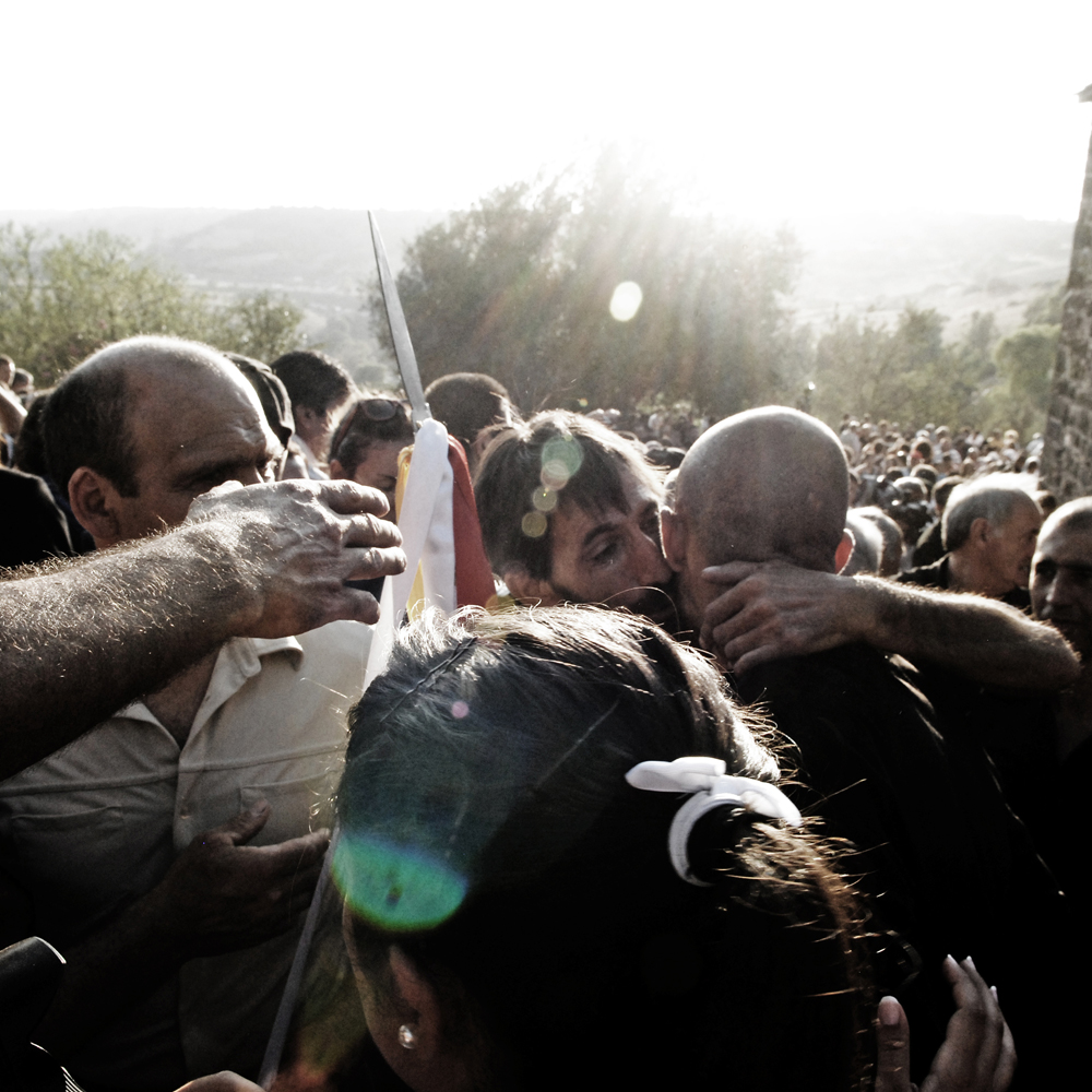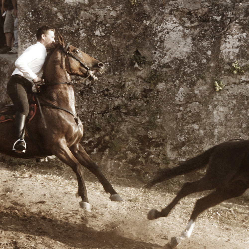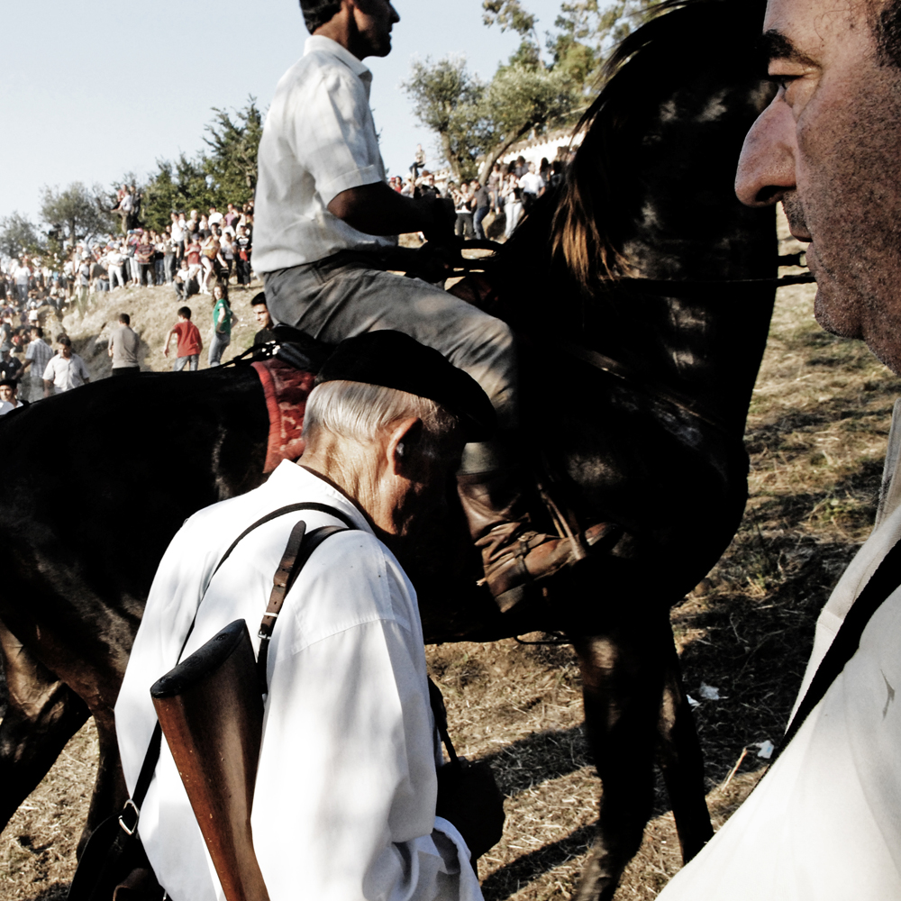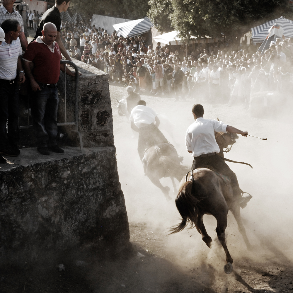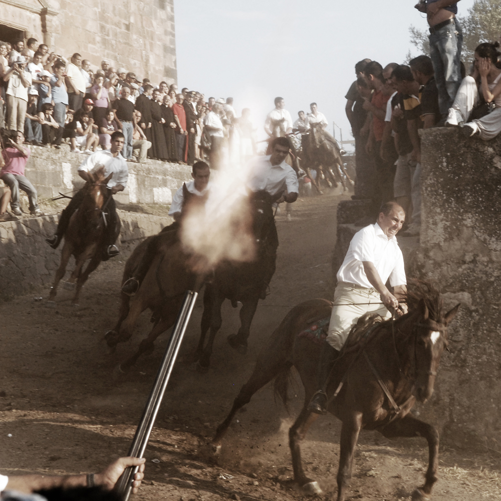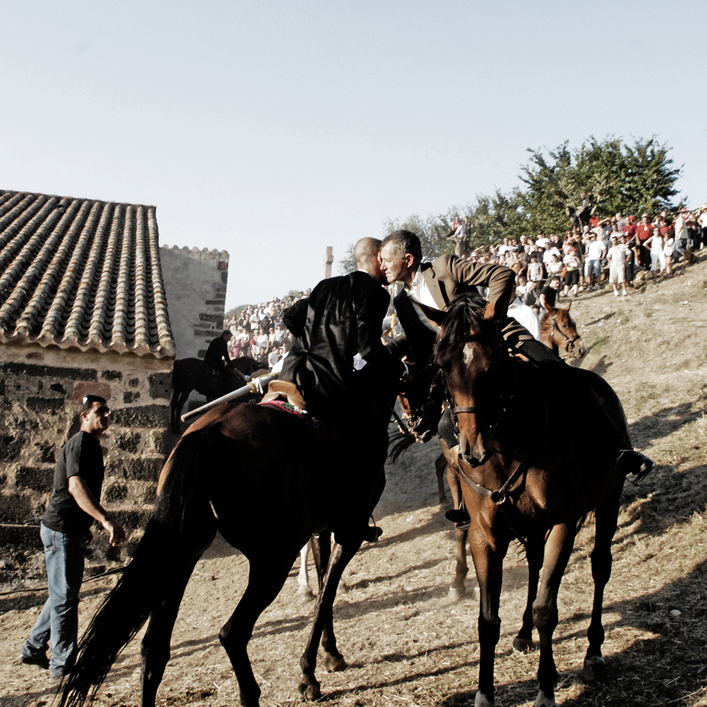 Barbagia is a large mountainous area in the central-eastern part of Sardinia, the Italian island that has extraordinary nature. There are also many isolated villages where people still follow and respect ancient traditions. They live out mostly of sheep-farming and horse-breeding. In the village of Sedilo, every year, a hundred of the most daring and brave horse riders participate in a wild and unrestrained race: the S'ardia. They don't race for money or glory but to show their devotion to a warrior saint, Saint Constantine. Actually he is not a proper saint, according to the Vatican Church that never approved him; but he is to Sedilo’s people, who celebrate his deeds. Riders run down the hill at full gallop, pounding towards the narrow entrance below the Arc of Constantine at full speed amongst rifle shots and clouds of dust.