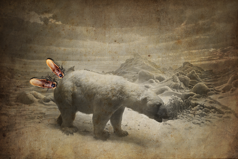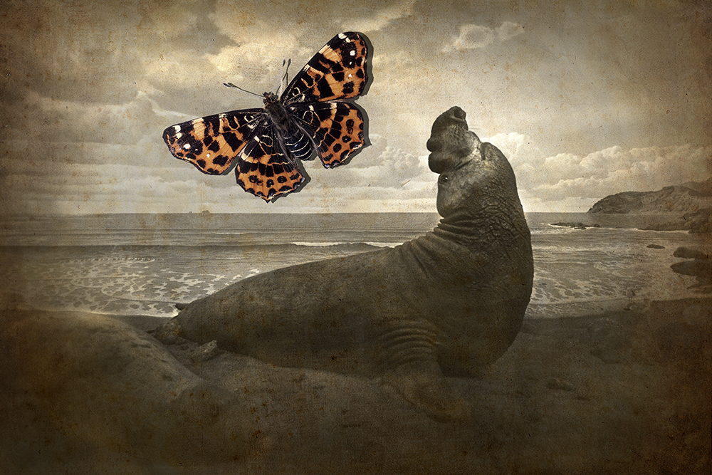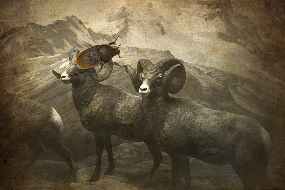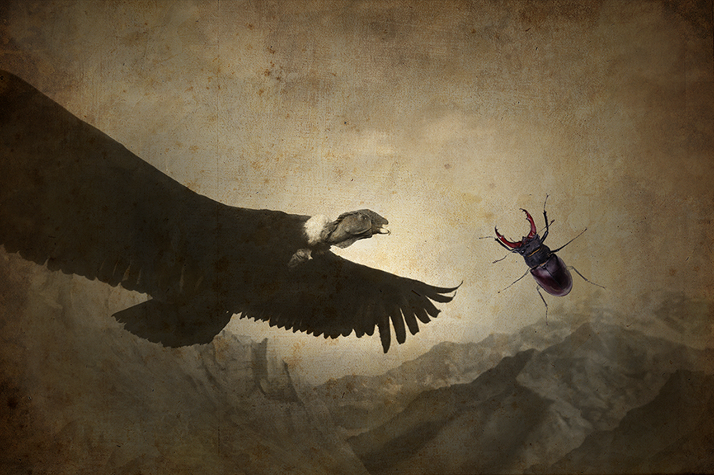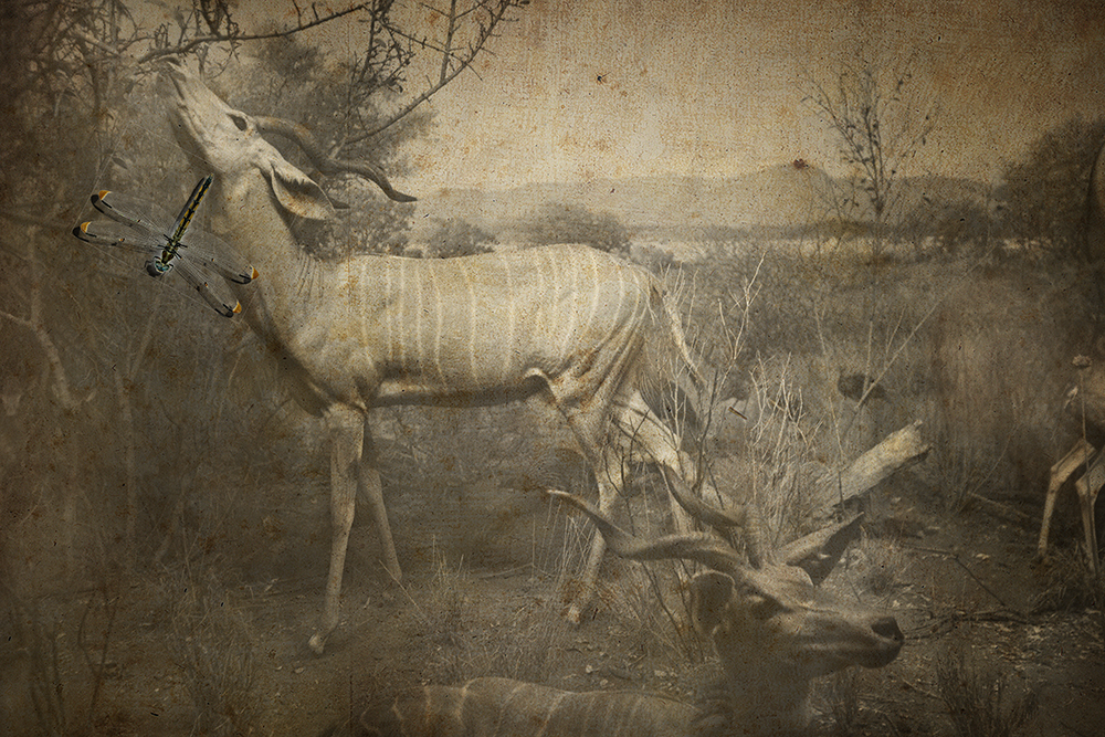 The metanimalia series is based on the overlapping of two visual layers and was inspired by a personal experience of mine, that of the rediscovery of an old photo of a fawn i had taken which insects had settled upon. This led me to the idea of combining the one level of wild animals in their natural habitat, evoking the style of the prints of19th century naturalists. And the second level being that of small animals living in their natural habitat and moving over the images in a visual game, not bereft of irony. My desire was to express the idea that animals live beyond simply their taxonomy and our need to fit them into representative ideals.