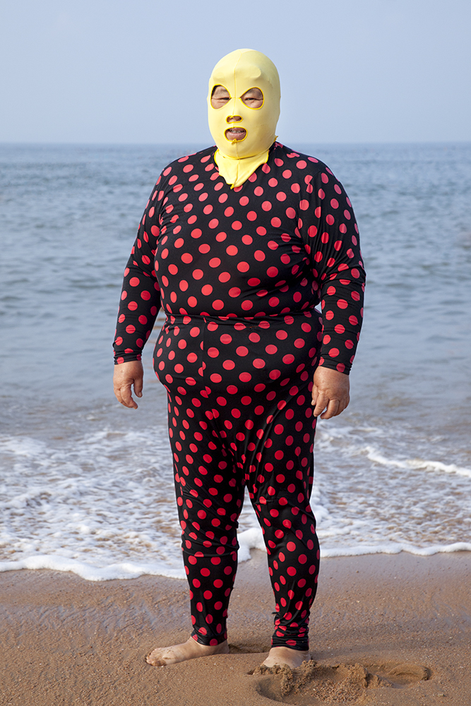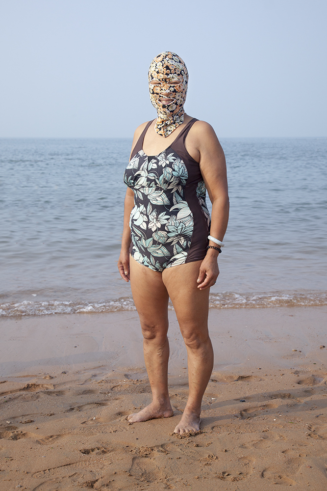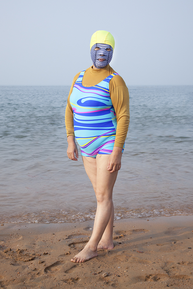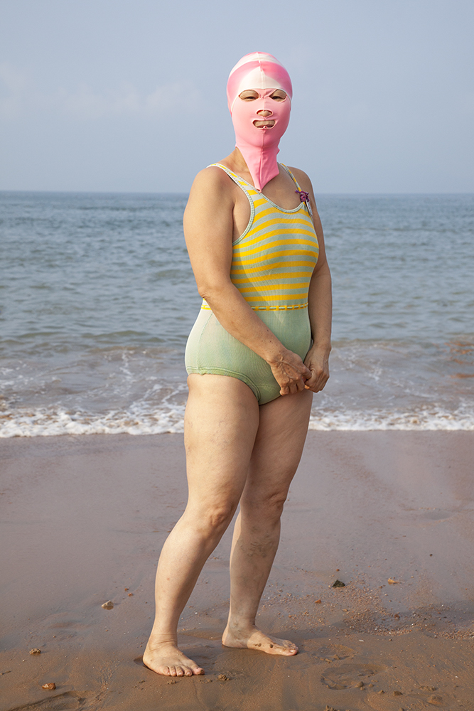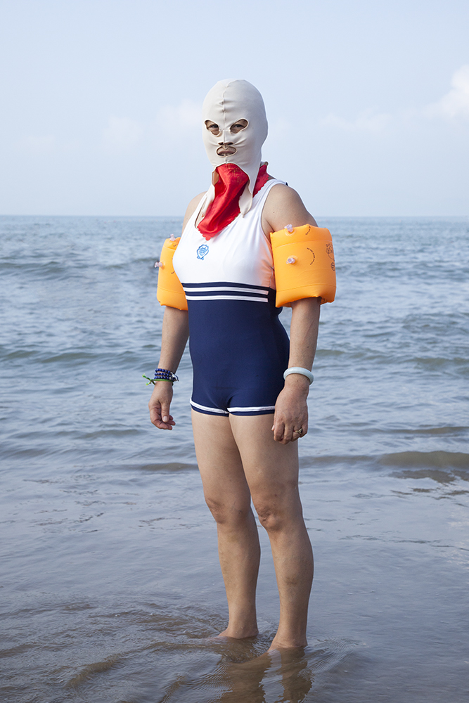 These Chinese swimmer wear masks and Full Body Suites to protect themselves from the sun and jellyfish stings. Some are bought in local shops or home made.