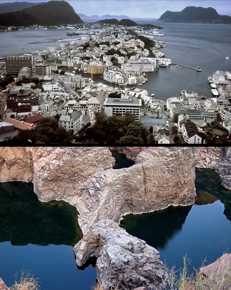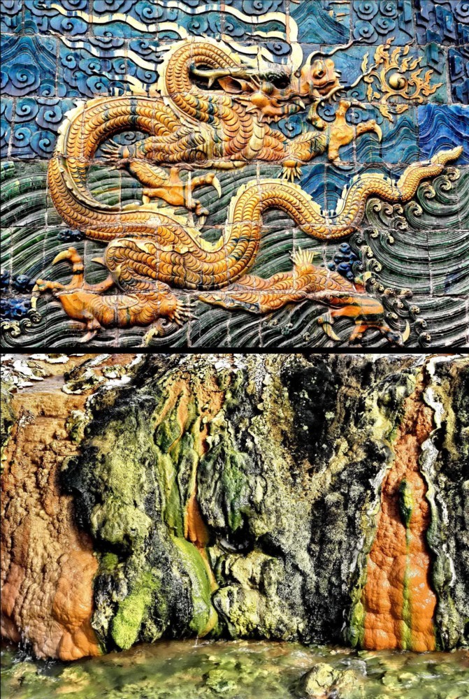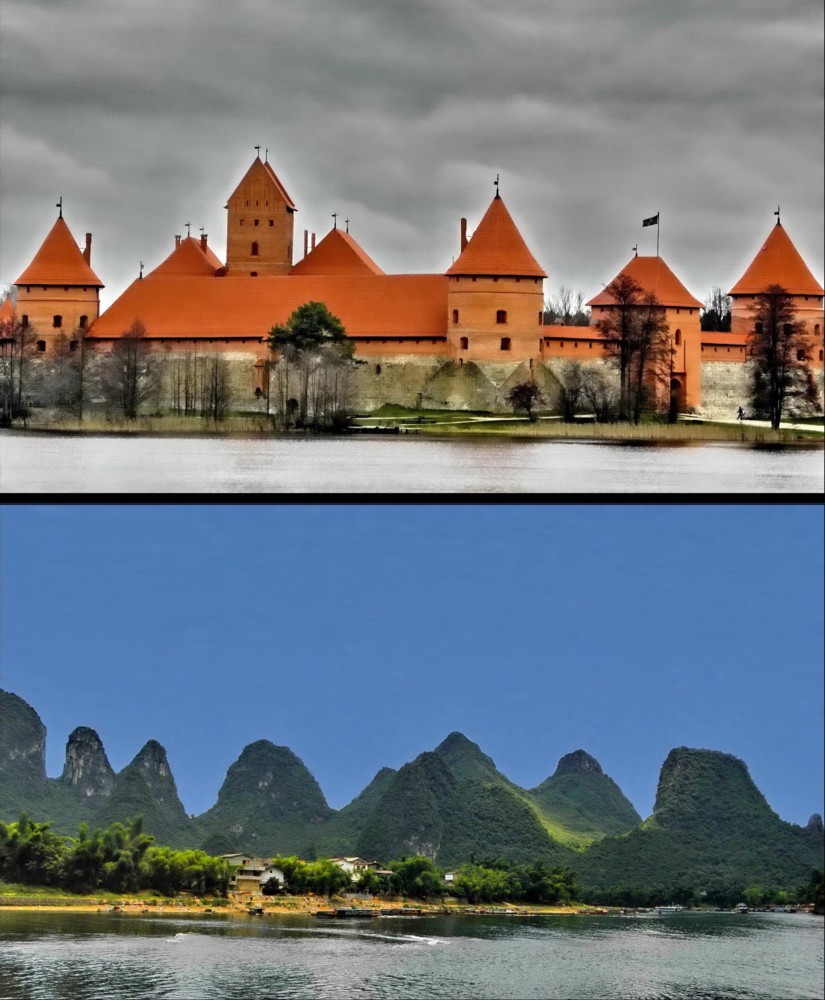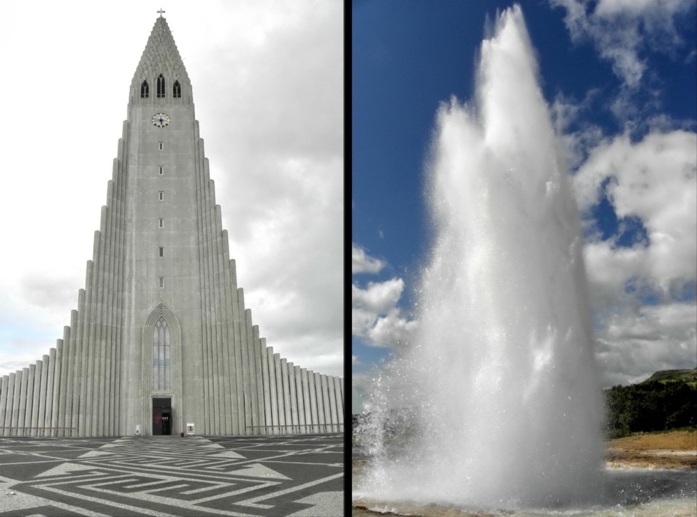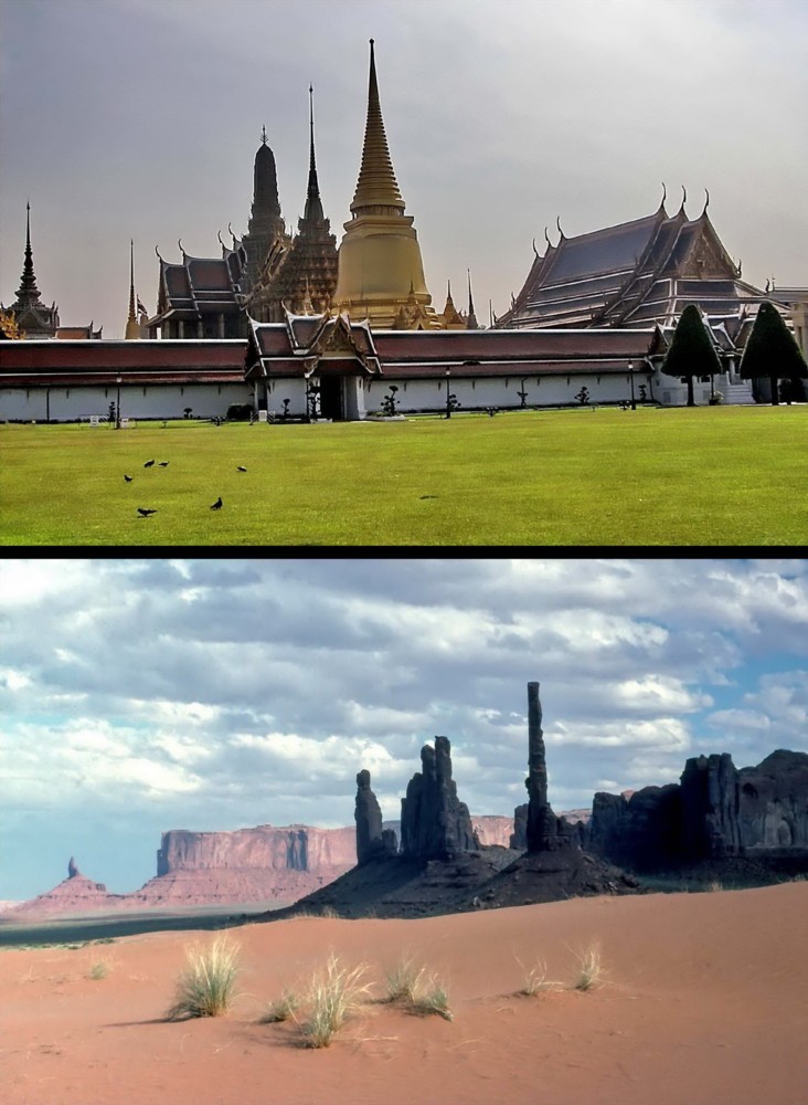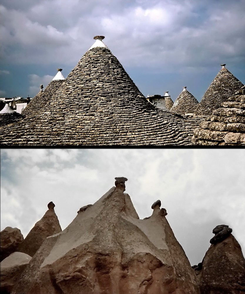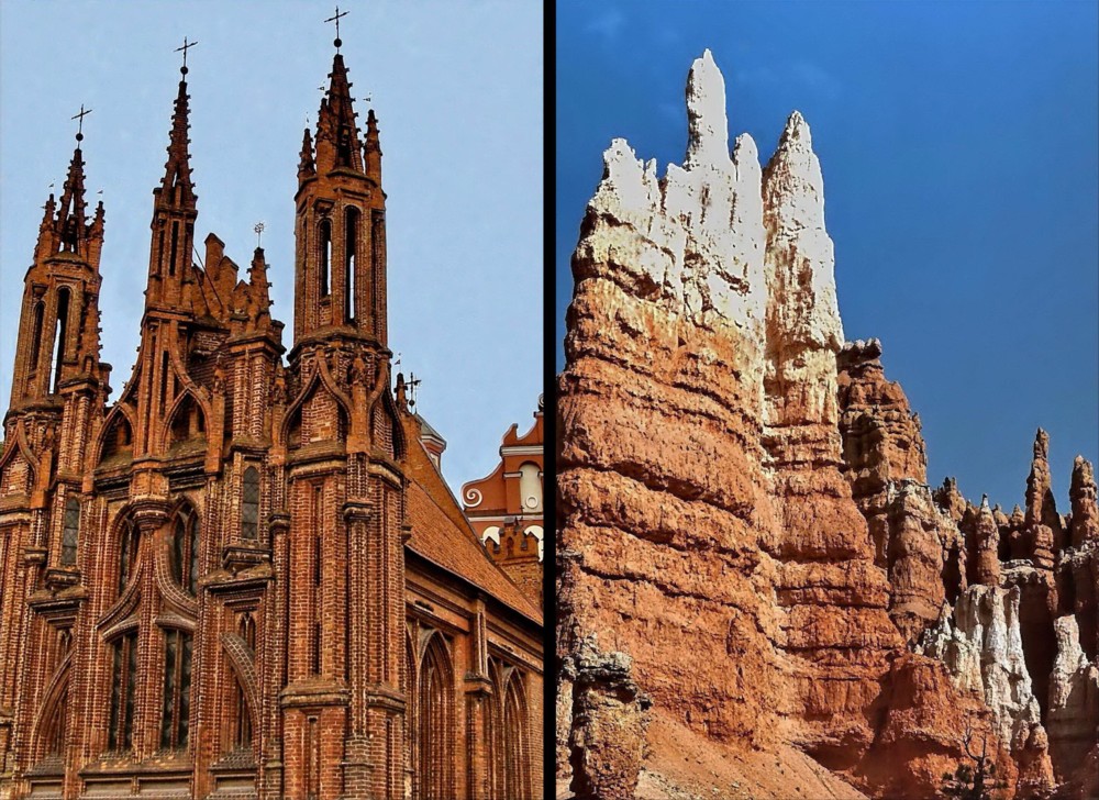 In this photos series a very original and unique idea of the author has been realized - to compare creations of the Almighty and man concerning objects of nature and architecture. The photos reveal amazing likeness of those objects. One was not searching for this likeness in advance, it became evident studying photos of various journeys. In this series are photos from author's journeys in Thailand, Turkey, China, Italy, Iceland, USA, Norway, India and Lithuania. The first photo (M1.jpg): the buddhist stupa, Chiang Mai, Thailand and the rock in Capppadocia, Turkey. The second photo (M2.jpg): the castle on the island, Trakai, Lithuania and the rocks on the bank of the River Li, China. The third photo (M3.jpg): the roofs of Trulli, Alberobello, Italy and the rocks in Capppadocia, Turkey. The fourth photo (M4.jpg): Hallgrim Church, Reykjavik, Iceland and Strokkur Geyser, Iceland. The fifth photo (M5.jpg): the panorama of the Royal Palace, Bangkok, Thailand and the rocks "Totem Poles", Monument Valley, Arizona, USA. The sixth photo (M6.jpg): the panoramic view of Alesund, Norway and the rocks of the River Ken, Panna National Park, India. The seventh photo (M7.jpg): St. Anne's Church, Vilnius, Lithuania and the rock in Bryce Canyon National Park, Utah, USA. The eighth photo (M8.jpg): a fragment of the Nine Dragon Wall, Datong, China and the hot springs creek, Iceland.