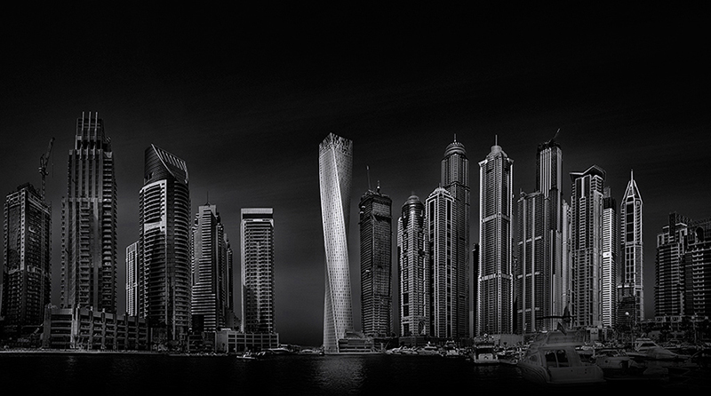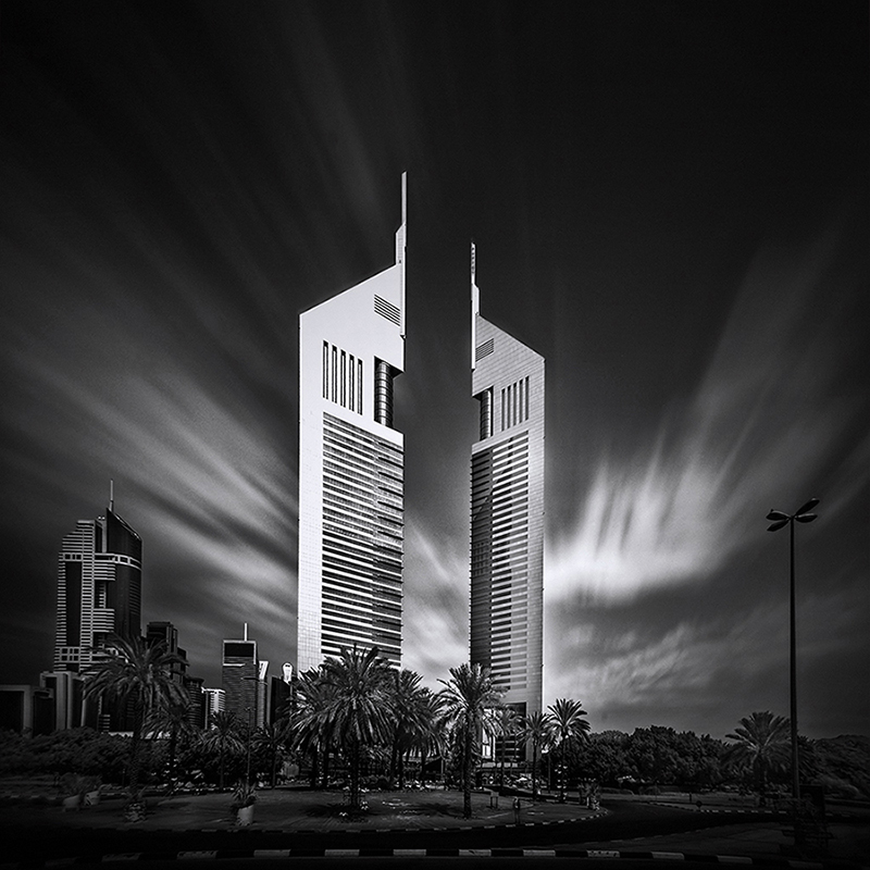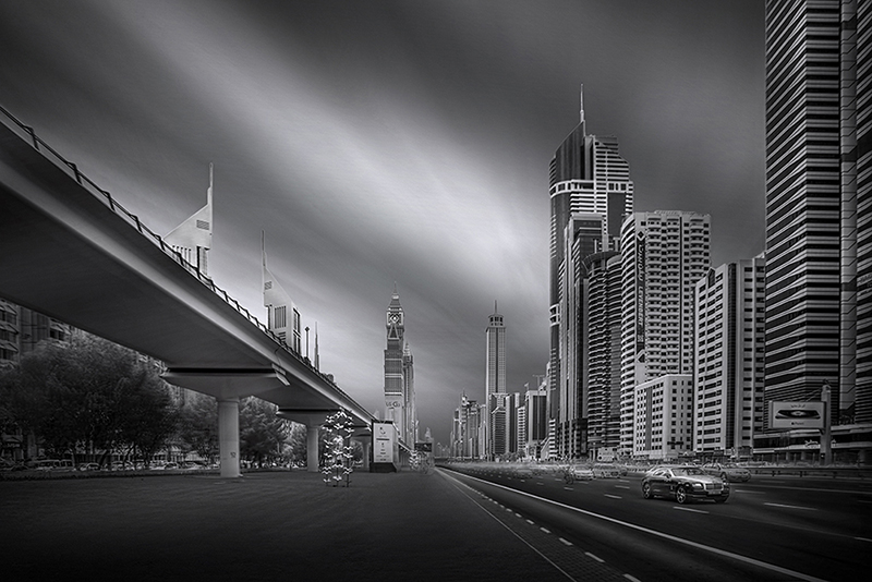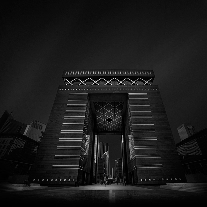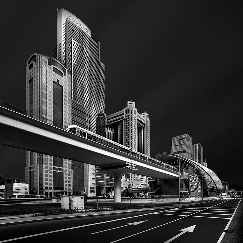 Dubai is a symbol of the future-present state of a city born in the sands but raised in the clouds. It is the spirit of the region realized with a spectrum of tones using multiple photographic methods to capture "abstract portraits" of its distinct architectural character and the vibrancy and velocity of an international city awaiting its destiny.