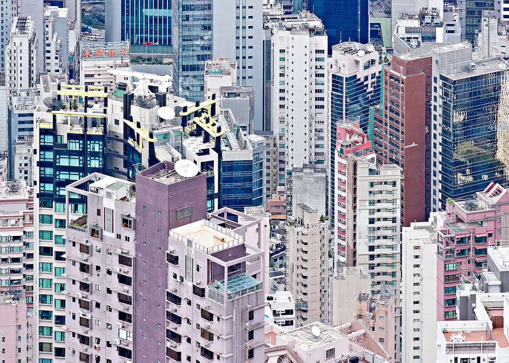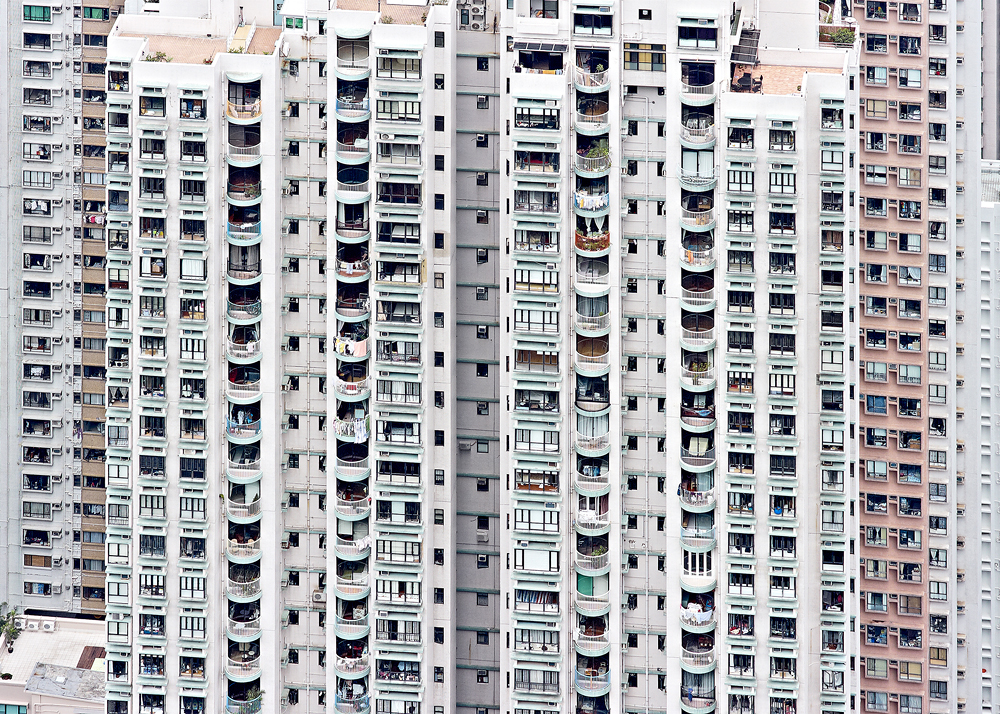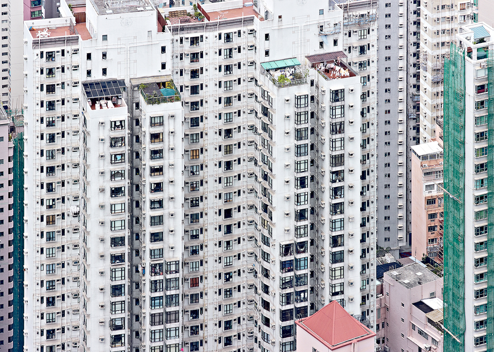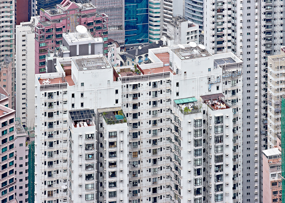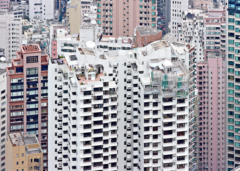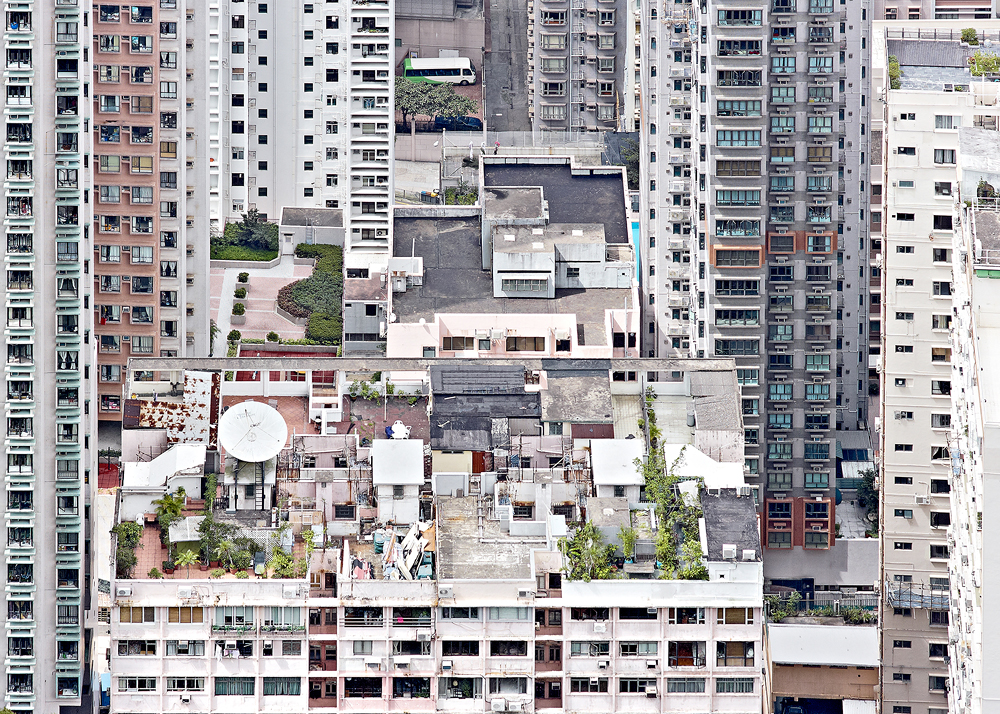 The series "Mass Storage" gives not only views on facades of Hongkong apartment buildings but also on their rooftops. These are normally hidden from the sight of passersby. The use of the rooftops ranges from garbage dump to miniature jungle.