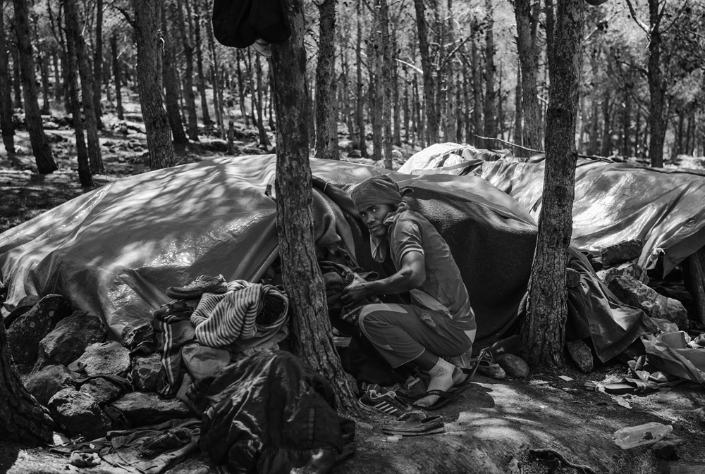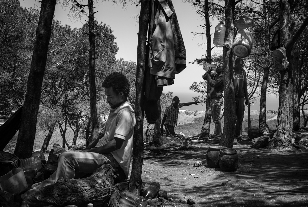 Every day hundreds of immigrants mainly from sub-Saharan Africa, survive in harsh conditions, hidden away in improvised camps of plastic, camouflaging in the beautiful natural environment of pine forest and rocks of Mount Gourougou, trying to avoid being located by Moroccan security forces, and try to circumvent the three consecutive metal barriers of about five km. in length and over eight meters high, equiped with concertina wire with -knives sharp-, separating and hinder the ultimate goal of achieving the European border city of Melilla, to comply with the dream and the right of every human being in pursuit of a dignified life, egalitarian and freedom of movement.