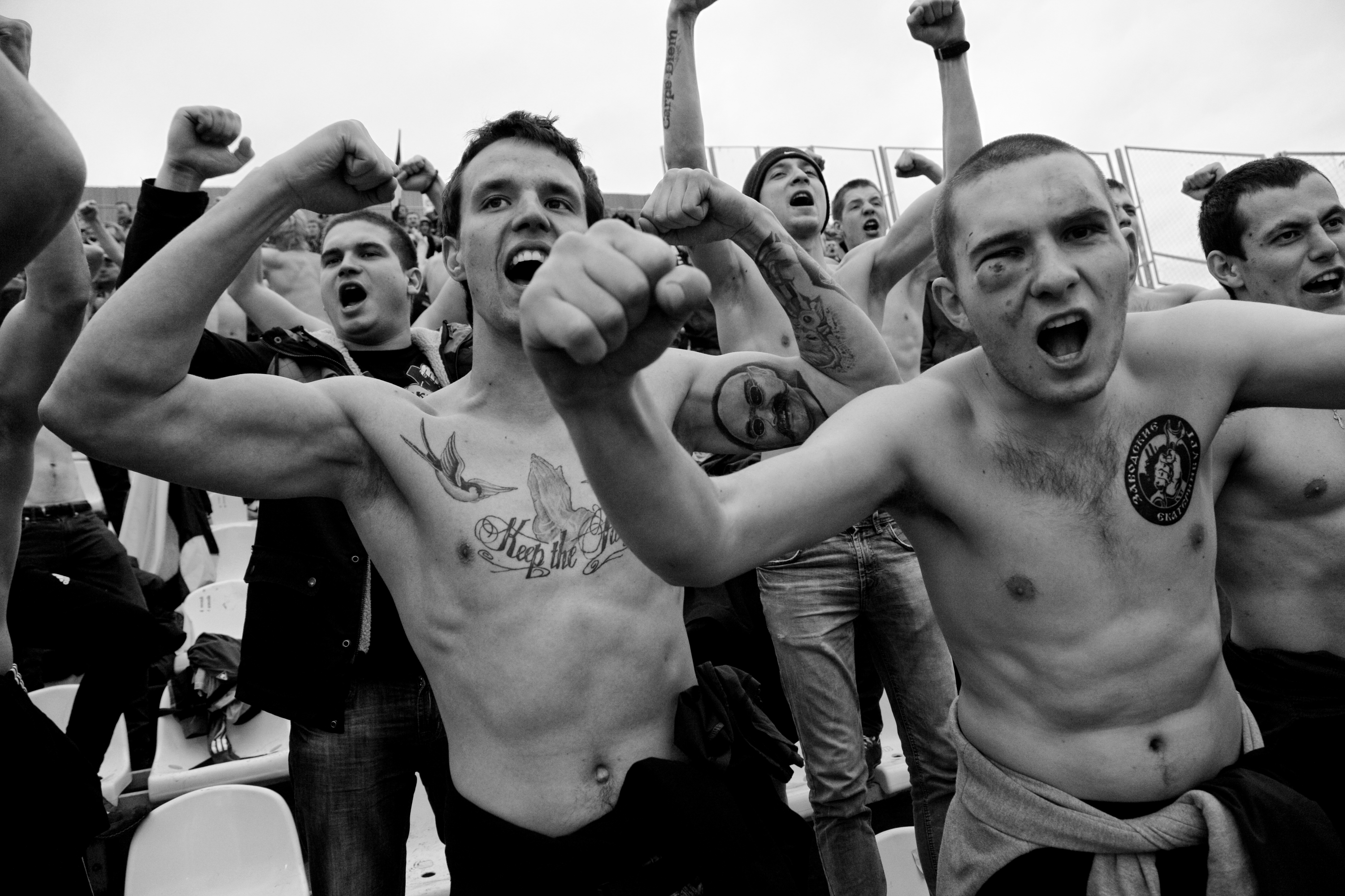 Russian football hooligans movement became popular in the 90's of the last century. First hooligans appeared in St. Petersburg and Moscow. In some time that wave swept over the whole country. Nowadays hooligan gangs can be found in any city which has it's own football team. Moscow and St. Petersburg football teams have from 20 to 50 gangs. Regional centers have from 10 to 20 gangs. I photographed football hooligans for 2 years. I travelled and attended football matches with them. No matter what you do in your everyday life, but when you join the gang you have to accept it's laws. And the main laws are solidarity, strength and cruelty. Every gang has hierarchy and authorities. The most agressive and courageous fighters become leaders of gangs.