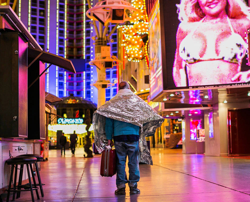“INSERT COINS†“This is story happening in Las Vegas ; it deals with the illusion and disillusion of the liberal system …†It is in the heart of this utmost symbol of entertainment made in USA that I have carried out my visual work since Christmas 2012. I am trying to cut through the varnish of illusions and artificial joys to give way to aimless wanderings where carnivorous casinos spit out lonely individuals as so many silent shatterings of a harmful liberal system.