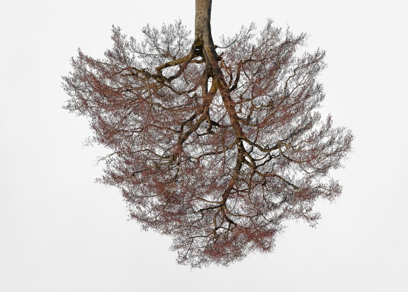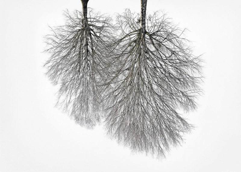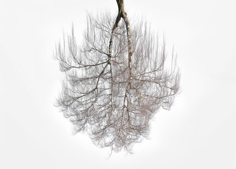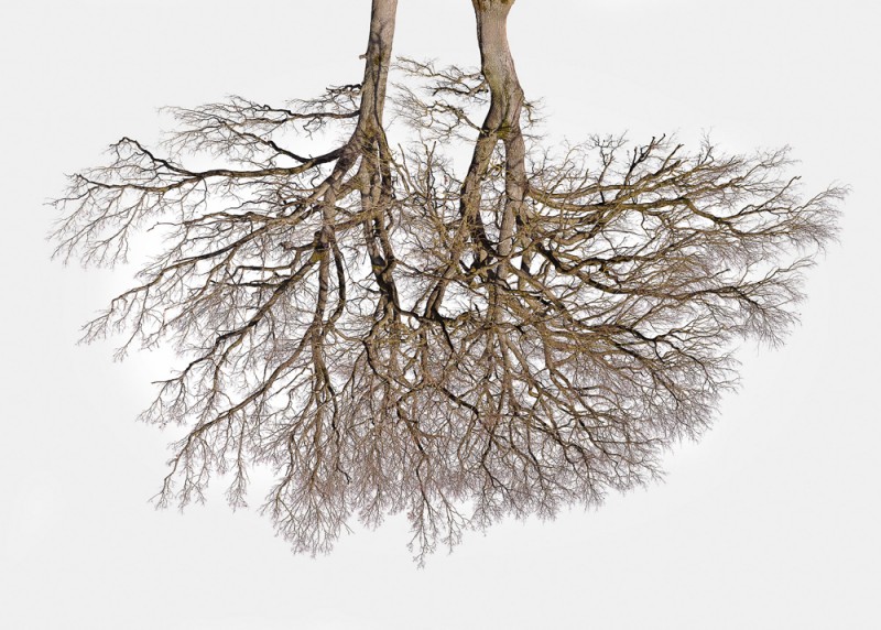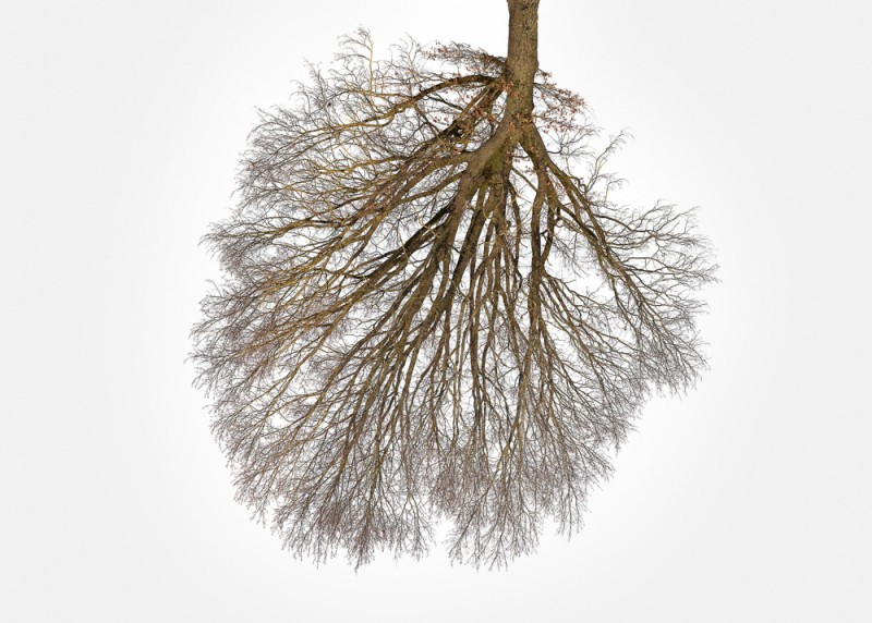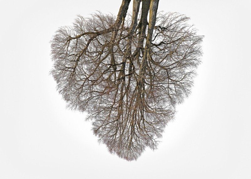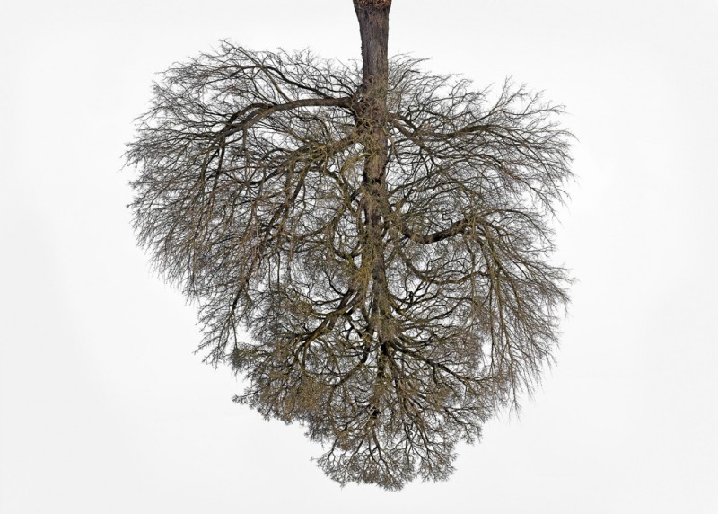 Trees take center stage in my life. I feel a deep reverence for their unique nature as I create my images. For me, trees represent the connection between energy (air, light) and the material world (soil, earth). Each time I am working on the tree crowns, I take numerous single frames to be assembled later, paying great attention to every detail, thus deepening the encounter. Through this intimate “face-to-face†with the trees, I want to capture the primordial energy of these ancient living beings. I opted to position the treetops upside down in the final work – just as they are projected onto our retina initially. Reversed in that way, the images remind me of roots, medicinal illustrations of a human lung, a family tree or a symbolic “tree of lifeâ€, as they appear in ancient traditional weavings. My series On the Nature of Things is based on a visualization of the alchemical formula “Above is one with below, inside is one with outside, spirit is one with bodyâ€.