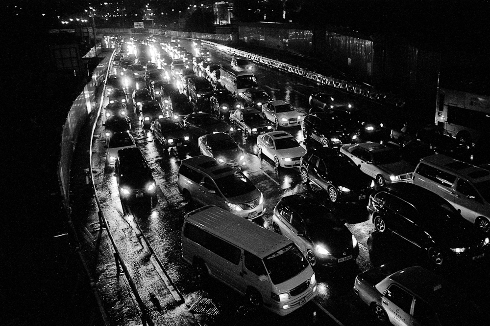 A city trapped between two cultures – in a perpetual sense of adolescence, trying out new styles to see where it belongs. Faux-traditional decorations everywhere speak of the eroding identity of its 7 million people. Born and raised in Hong Kong, I left for England when I was 17. In the decade that followed, I’ve rarely returned to see my parents and friends. I began documenting my visits back home during the Christmas of 2013 and 2014. My old jacket, haggard trousers and roll-up cigarettes seem half a century away from a world permeated with business suits and the latest street fashion. During the balmy December day I would visit my old stomping grounds with the few friends still in touch, retracing our teenage footsteps in Tsim Sha Tsui and Causeway Bay. Shopping malls standing in smog are joined by yet more shopping malls sprouting up, their strange names a reminder that I am now a foreigner in my own city. My visits are always brief. As I sit on the flight bound for Heathrow, I look at the strange yet familiar night sky one last time, hoping it won’t get too unrecognisable the next time I am back.