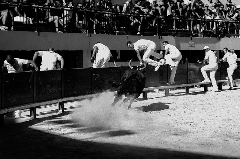 Mauguio : Few minutes away from Montpellier, right in the middle of a vineyard and market gardens there is a small village bathed by light from the south, the ligh of the Mediterranean sea. It is a land of history marked by generations of men who shaped the landscape and hearts with an unusual culture. Here begins the Camargue, with its proud Gardians, these immaculate horses and ebony bulls. It is a plain of groves where each path is a surprise. Between the flights of flamingos, eel fishermen, everything is quiet, surrounded by silence, until these days when the village comes alive around the bullfighting culture, the music and dance. I try to explore these moments