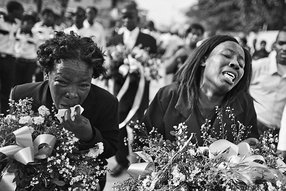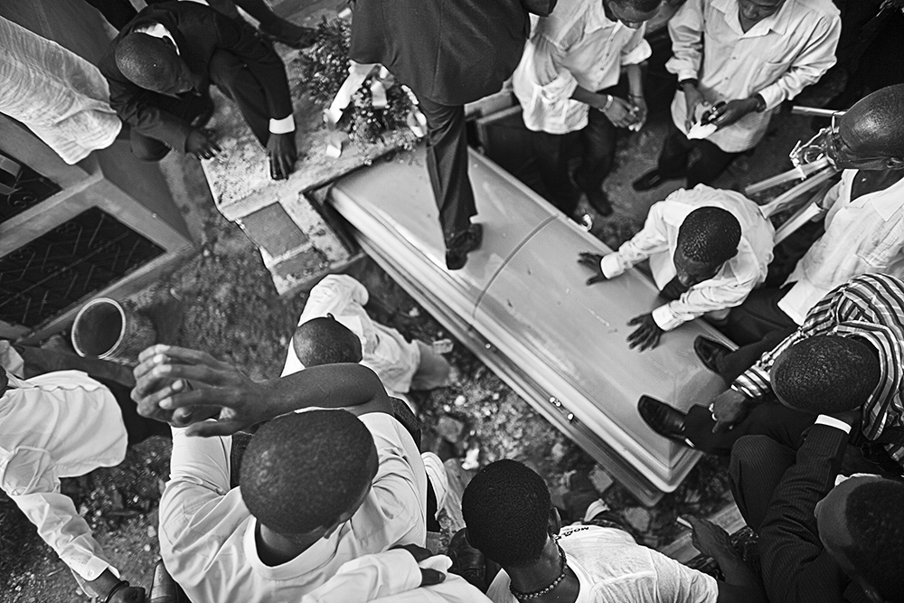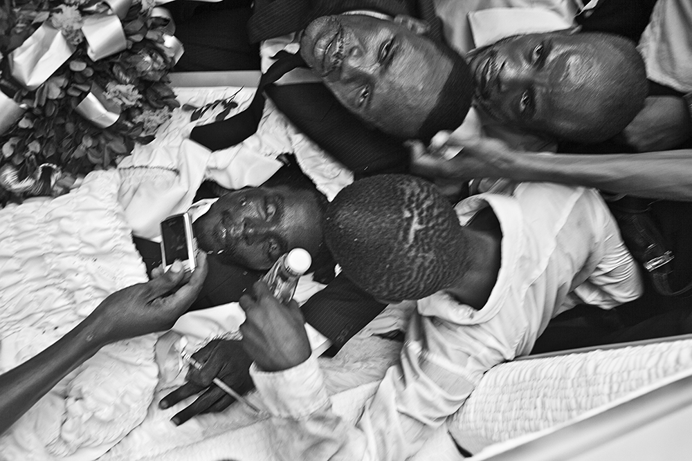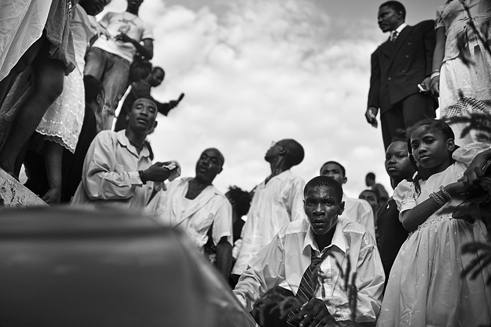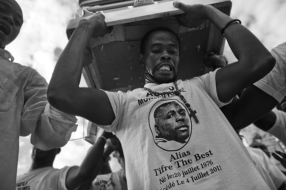 Monexil Yonel, alias Tifre The Best, was a Christian young Haitian who played in a rasta band. This is a portfolio on his funeral with voodoo rituals. His funeral was a mixture of sadness and joy. I was in the main cemetery of Port-Au-Prince trying to search of any images related to voodoo, and suddenly there appeared a group of boys carrying a coffin, while singing rasta songs. Behind them was the family, with faces of deep sadness and pain. The funeral was a real show, they opened the coffin several times to take the last pictures with him, giving him a drink of rum and, of course, as is normal in a voodoo funeral, to put a salt lick on the hand to ensure that it could not become a zombie.