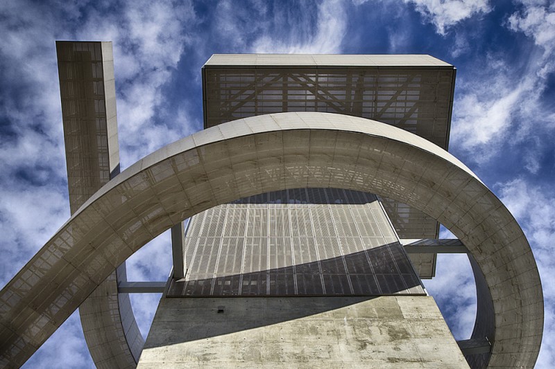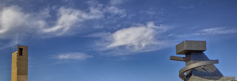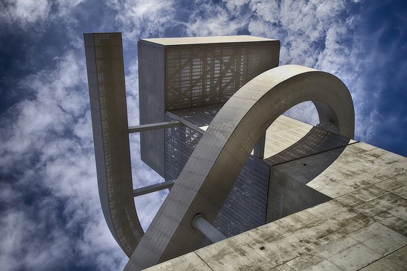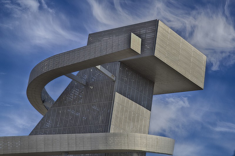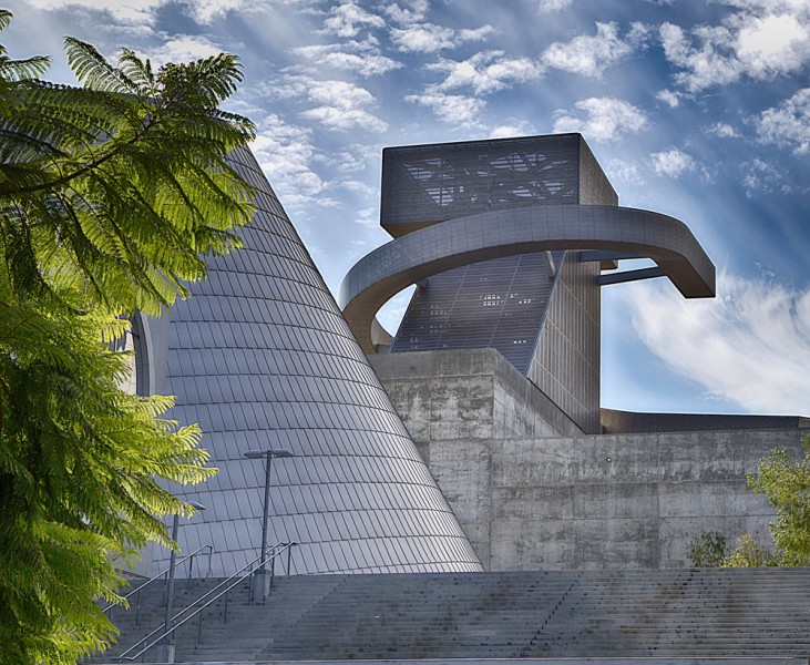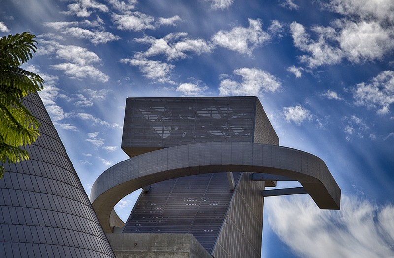 Various views of the theater building on the campus of the Ramon C. Cortines School of Visual and Performing Arts in Los Angeles, California.