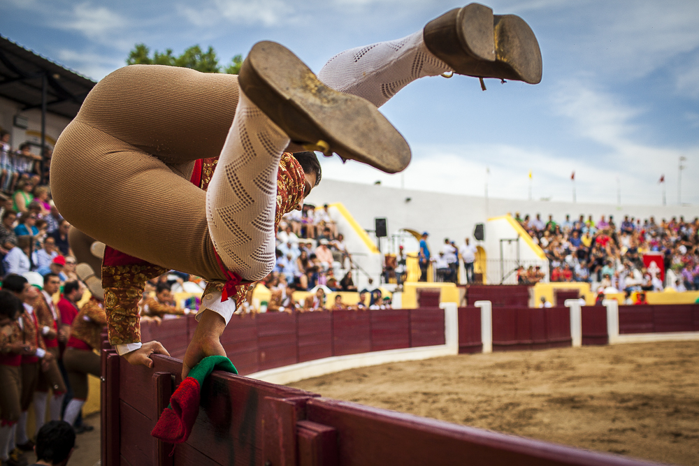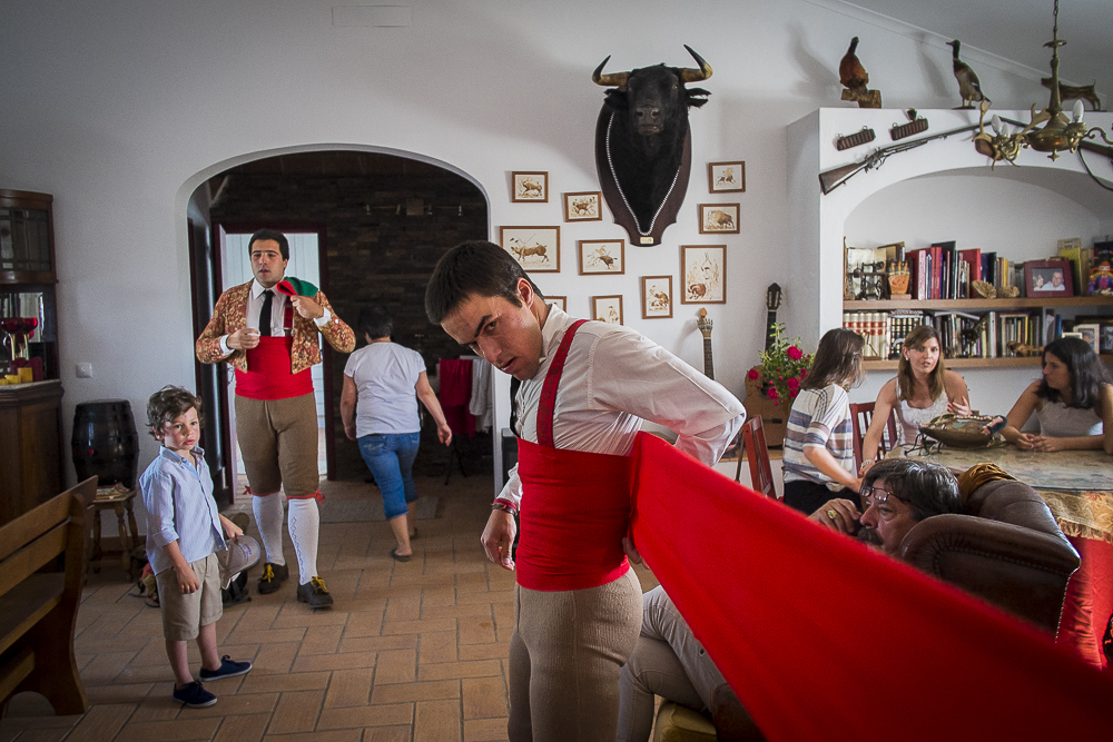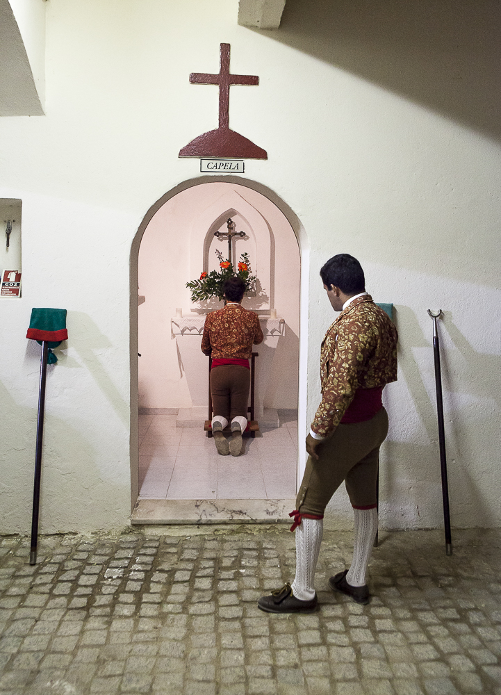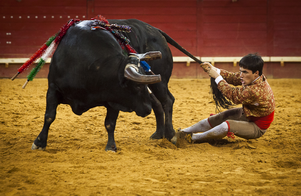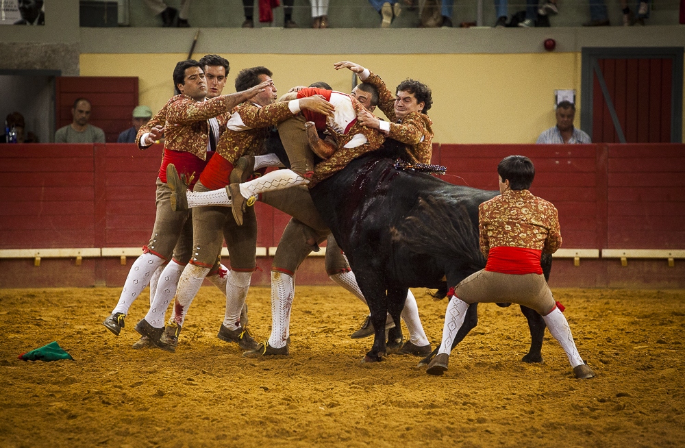 Portuguese forcados lie somewhere between the bull riders of the Americas and the bloodier bullfighters of Spain. Unlike in Spain, where the bull is stabbed to death if the matador manages to win the contest, the forcados wrestle the animal (whose horns are capped) with their bare hands as a display of determination and bravura. The Spanish recently moved to permanently legalize deadly bullfighting (after the region of Catalonia outlawed it), but Portuguese royal law banned the killing of bulls in the arena in 1836. And while few can say the bull enjoys himself overmuch in the Portuguese arena, he does live to see another day. Usually, a group of eight forcados challenge the bull in concert. The front man provokes the bull into a charge so that he can perform a pega de cara (a “face catchâ€). He secures the bull by its neck or horns and must maintain himself on the bull’s head until the other members of the group can hold the animal and enable the man to extricate himself. The team’s rabujador then holds on to the tail to finish off the performance. The forcados are amateurs. Each team earns as little as €600 per contest, which allows them to pay for the group’s insurance and perhaps a celebratory dinner after the match. But still they do it year in and year out, because they are young men with much to prove, and a tradition to uphold.