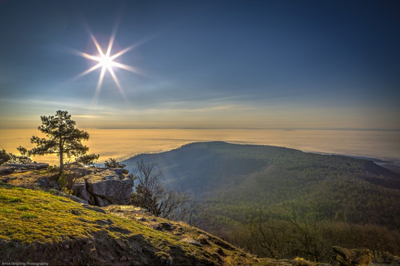 There is a layer of fog in the near distance. This fog was covering the valley and town below. this is a 5 photo set for HDR. It was created with a Canon 5DMKIII, 24-70mm Canon lens. Used a Promote Control to space the shots and Lightroom and Photomatix to finish the photo.