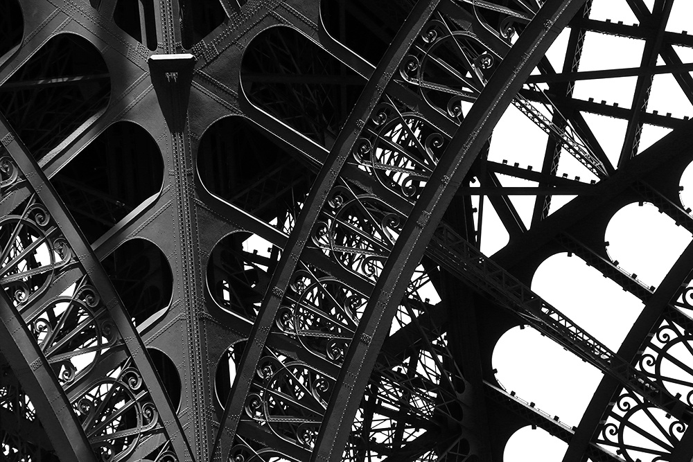 A detail of the Eiffel tower illustrates its strength and delicate beauty. Converted to black & white.