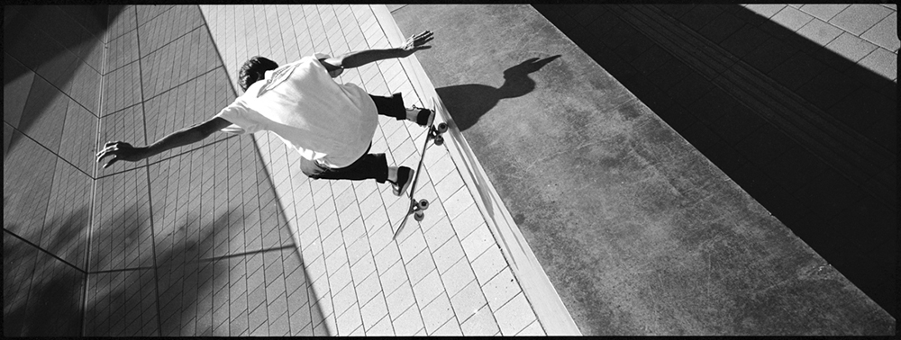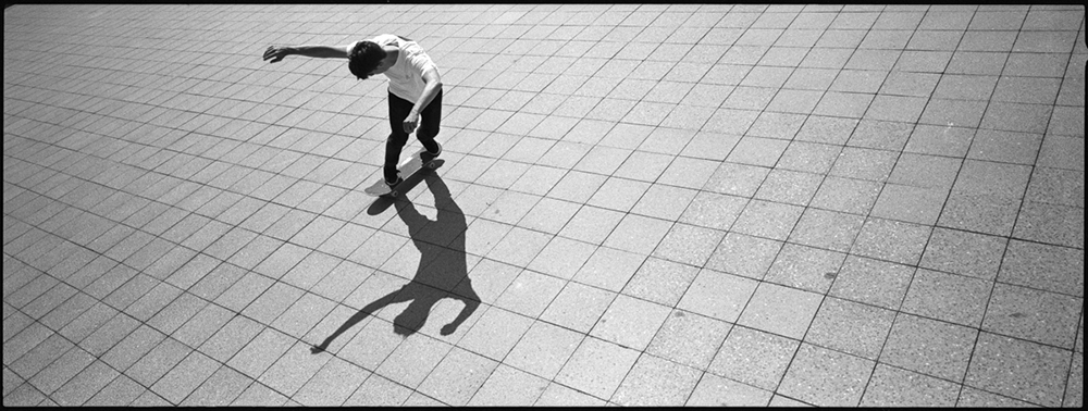 In general, skaters like to explore the urban space with their skateboard. Compared to “non-skatersâ€, a skateboarder tends to see the city of Berlin with different eyes. Edges, stairs, lines, areas and other spatial objects automatically draw our attention. You immediately start picturing in your head what could possibly be done with a skateboard at these special places and what not. Lines determine the direction of thinking. And almost every day, we find ourselves struggling with waxed lines of concrete, spending a considerable amount of time on the cold ground, just for the sake of it. For outsiders, it’s difficult to comprehend why we scream at concrete edges and behave like the alpha male marking its territory. But in fact, the street is the home of our subculture. I tried to capture this symbiosis of skateboarding and the urban space we all move in on 35mm. At places that are more to us than just a simple line. Skateboarding in the format 24mm X 65mm on Kodak Tri-X 400.